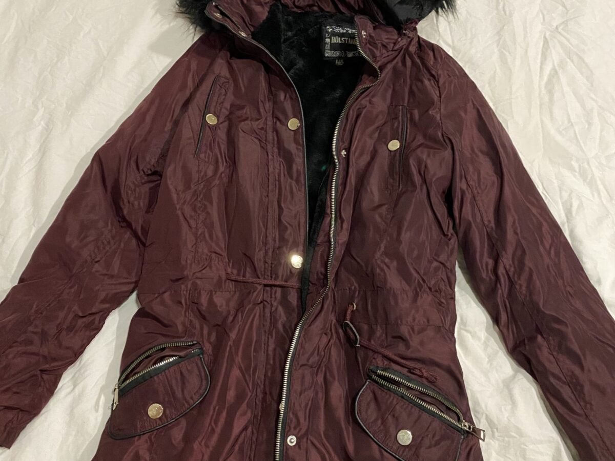 Abrigo estilo deportivo con cuello alto, color morado. Estado como nuevo, muy poco uso, talla Small, no queda ajustado.