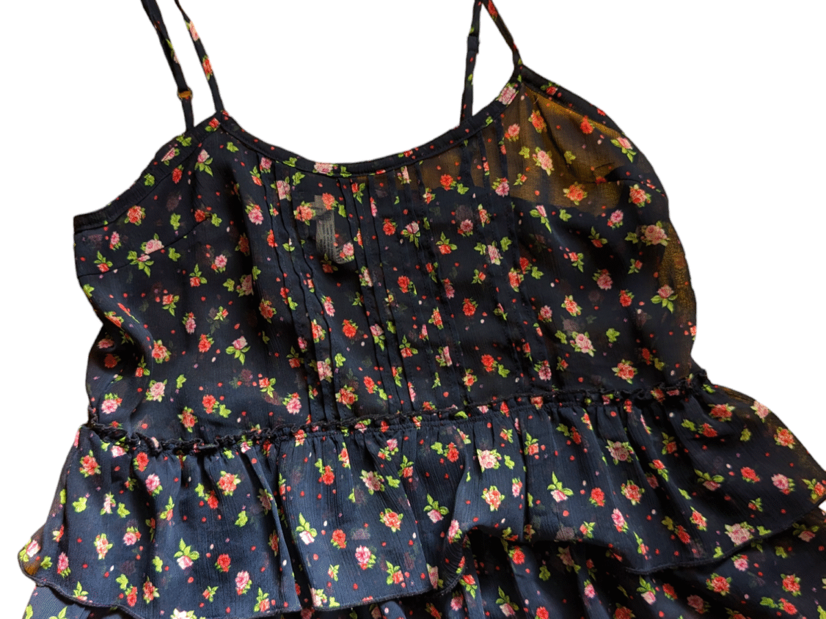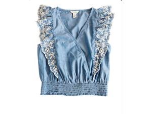 Blusa Azul Talla Large (L) Marca: Carol Rose Material: 95% rayón, 5% spandex (cuerpo) Contraste: 100% poliéster Características: Manga corta Diseño de cuadros tipo malla en la parte superior Esta blusa ofrece un estilo fresco y elegante, con un detalle de malla que aporta un toque distintivo. Ideal para un look semiformal.