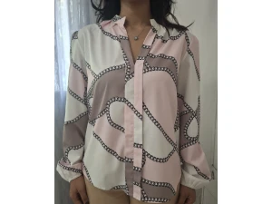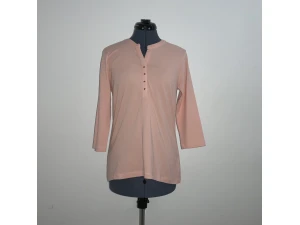 Blusa formal color rosa palo, marca LA MODE. Con cuello redondo, abertura en V, mangas 3/4 e imitación de botones. Tela: 96% algodón, 4% elastano.