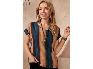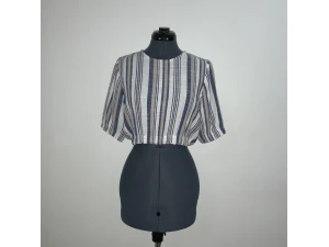 Blusa con rayas (azul rey, beige y crema), marca Zocca. Con mangas al codo y elástico en la parte de la cintura y mangas. Tela: 70% rayón, 30% lino.