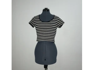 Blusa crop con rayas (negras y grises), marca Forever 21. Con mangas cortas y cuello redondo.