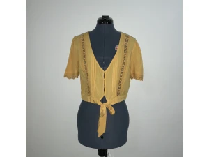 Blusa color mostaza, marca Forever 21. Con encaje, lazo, escote en V y botones.