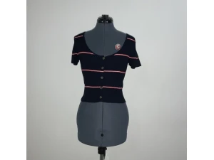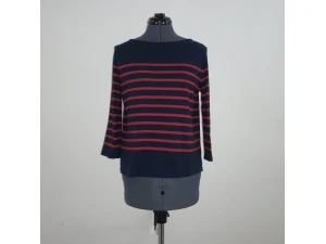 Blusa color azul marino con rayas horizontales (rojas), marca MNG (MANGO). Con cuello redondo (amplio) y mangas 3/4.