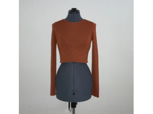 Blusa crop top color anaranjada, marca Stradivarius. Con cuello redondo y mangas largas. Tela: De punto y brillante.
