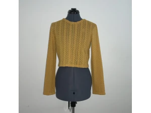 Blusa con transparencia color mostaza, marca ZARA. Con cuello redondo y mangas largas.