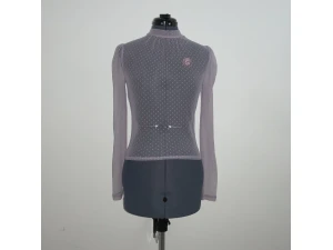 Blusa de malla color lila, marca Forever 21. Con cuello alto, mangas largas (abullonadas) y abertura en la parte de la espalda.