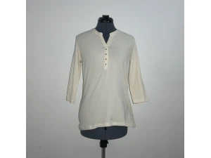 Blusa formal color crema, marca LA MODE. Con cuello redondo, abertura en V, mangas 3/4 e imitación de botones. Tela: 96% algodón, 4% elastano