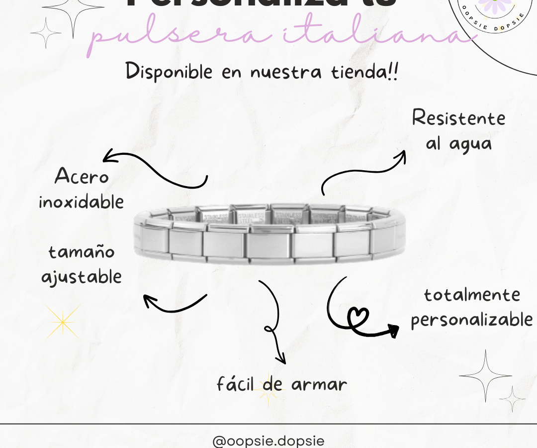 Las Italian Bracelets son esas pulseritas armables que están súper de moda ✨. Son como un rompecabezas de acero inoxidable donde vas agregando los charms que más te gustan: letras, dibujitos, símbolos o cualquier diseño que te represente. Lo mejor es que puedes personalizarlas a tu estilo, cambiando los charms cuando quieras y creando combinaciones únicas. Básicamente, ¡llevas en tu muñeca una pulsera que cuenta tu historia!