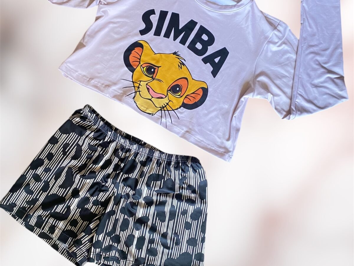 Conjunto de pijama suéter corto manga larga con diseño del clásico animado simba y short estampado. Talla única, ideal para tallas S y M Apto para Adolescentes y Adultos