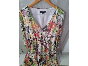 Hermoso vestido tipo kimono, ajustable en la cintura. Color fucsia con detalle de hojas y flores en turquesa, violeta y naranja. Usado una sola vez, por un par de horas.