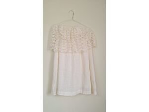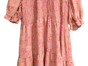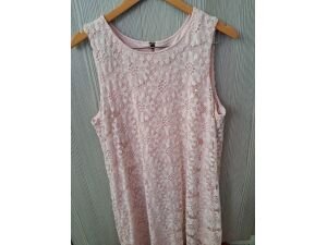Vestido de Encaje rosado con mangas de mesh transparente del color del vestido. Tiene un detalle en una de las flostes en la parte de atrás inferior de la prendas