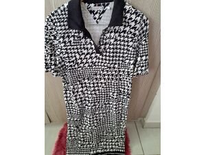Vestido blanco con cordón negro que se amarra en la espalda El vestido llega a la rodilla o un poco más corto Tiene doble tela en la parte de abajo, no transparencia