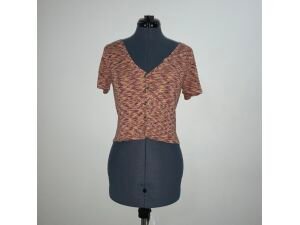 $6,00Blusa con escote en V (rosa, vino y amarillo), marca Forever 21. Con mangas cortas y botones. Tela stretch con relieve.