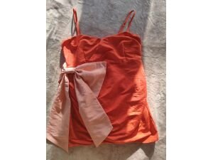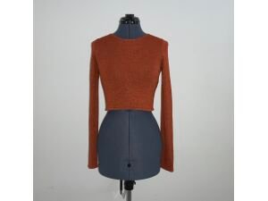 $5,00Blusa crop top color anaranjada, marca Stradivarius. Con cuello redondo y mangas largas. Tela: De punto y brillante.