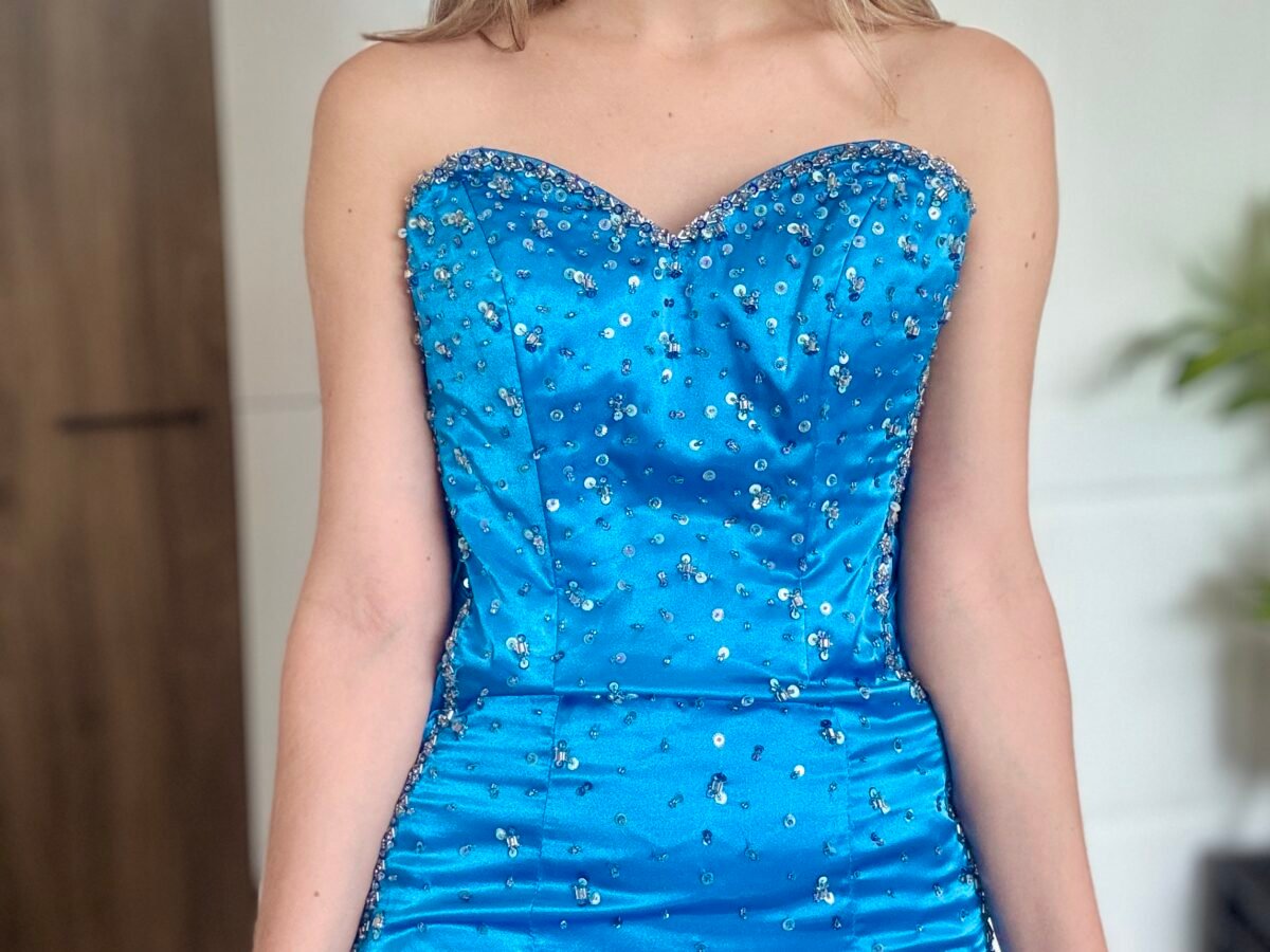 Elegante vestido de la prestigiosa marca Mori Lee, confeccionado en un vibrante azul eléctrico con delicadas aplicaciones de lentejuelas y pedrería, que añaden un toque de brillo sofisticado. Este diseño strapless con escote corazón y ajuste corset en la espalda realza la figura, creando un look femenino y estilizado. Aunque pertenece a la colección de novias, es perfecto para eventos formales, galas o fiestas. Talla 0/XS. Nota: en la foto no se aprecia completamente cómo entalla debido a que el vestido corre pequeño y no me ajusta.