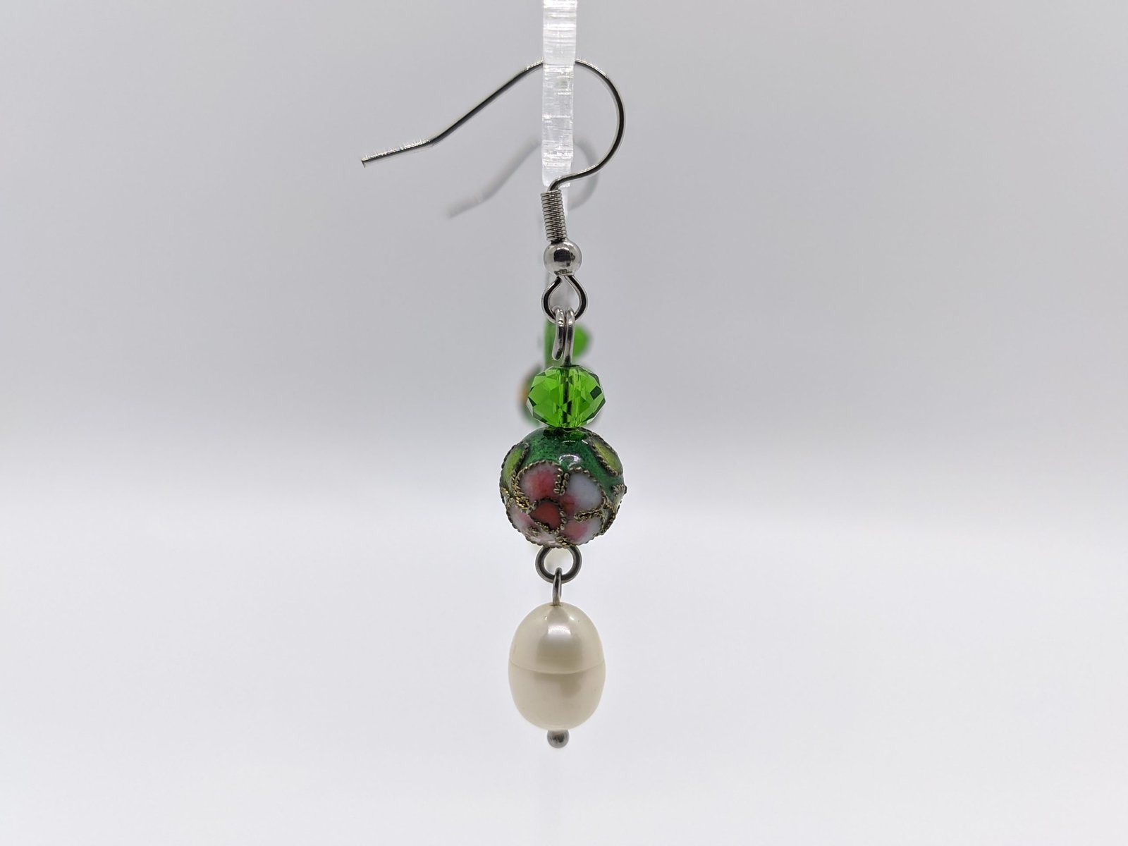 Aretes de acero con perlas, cristal y cloisonne. Largo: 5 cm