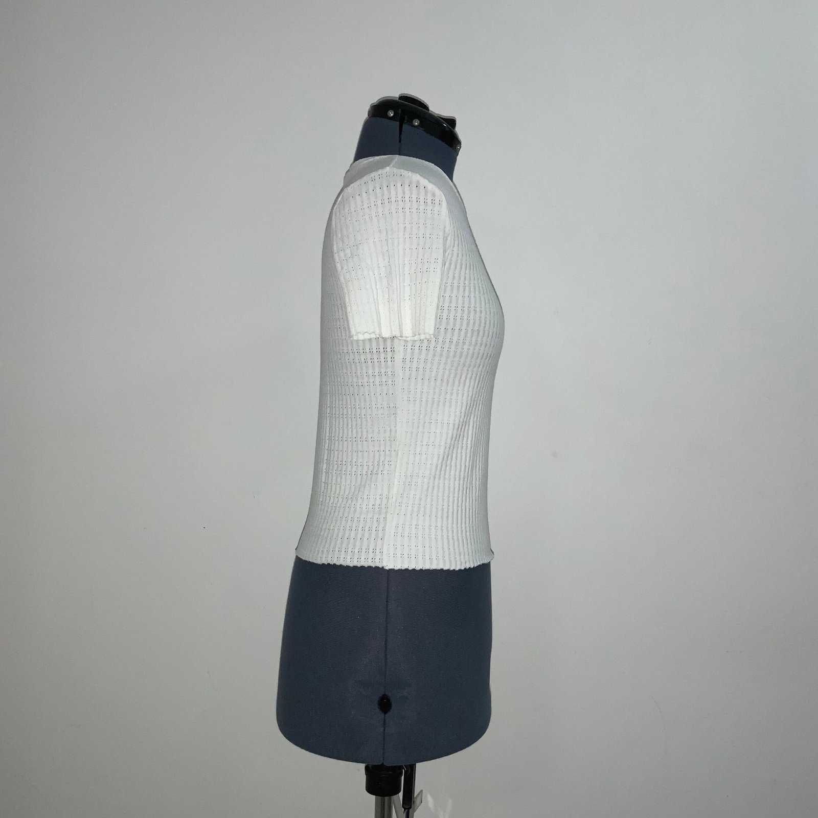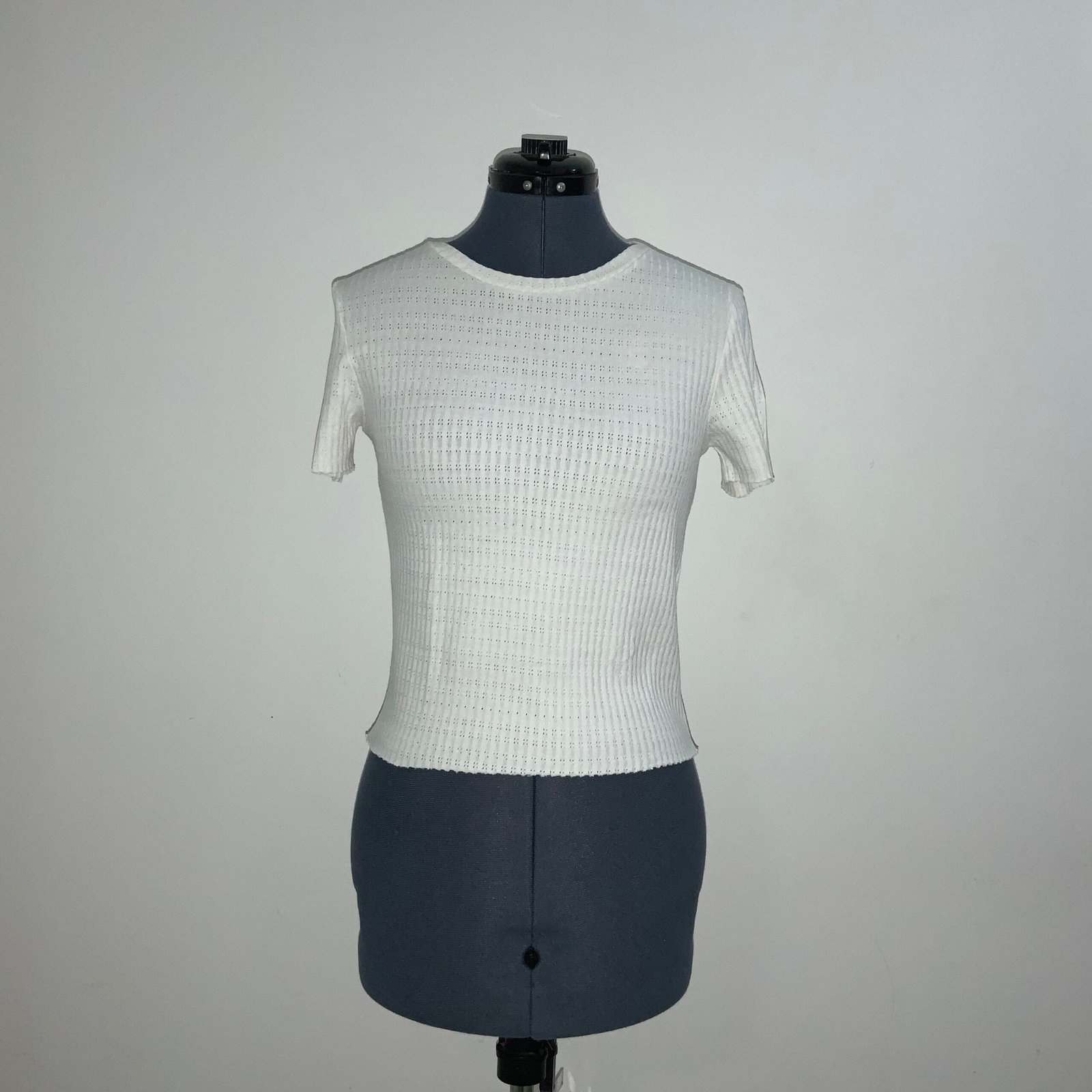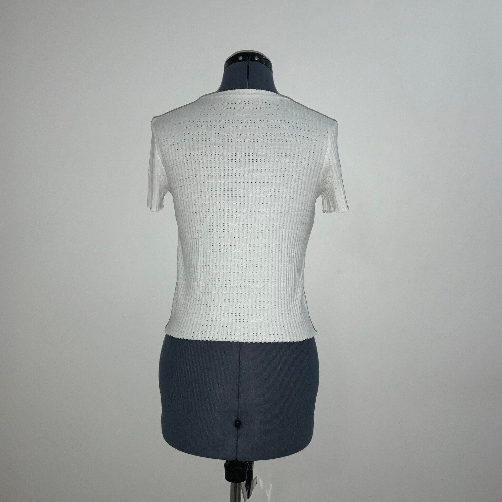Blusa blanca, marca ZARA. Con cuello redondo y manga corta. Tela stretch con relieve.