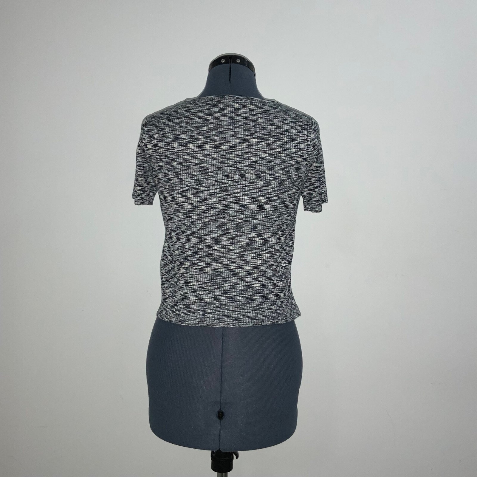 Blusa con escote en V (azul y blanco), marca Forever 21. Con mangas cortas y botones. Tela stretch con relieve.