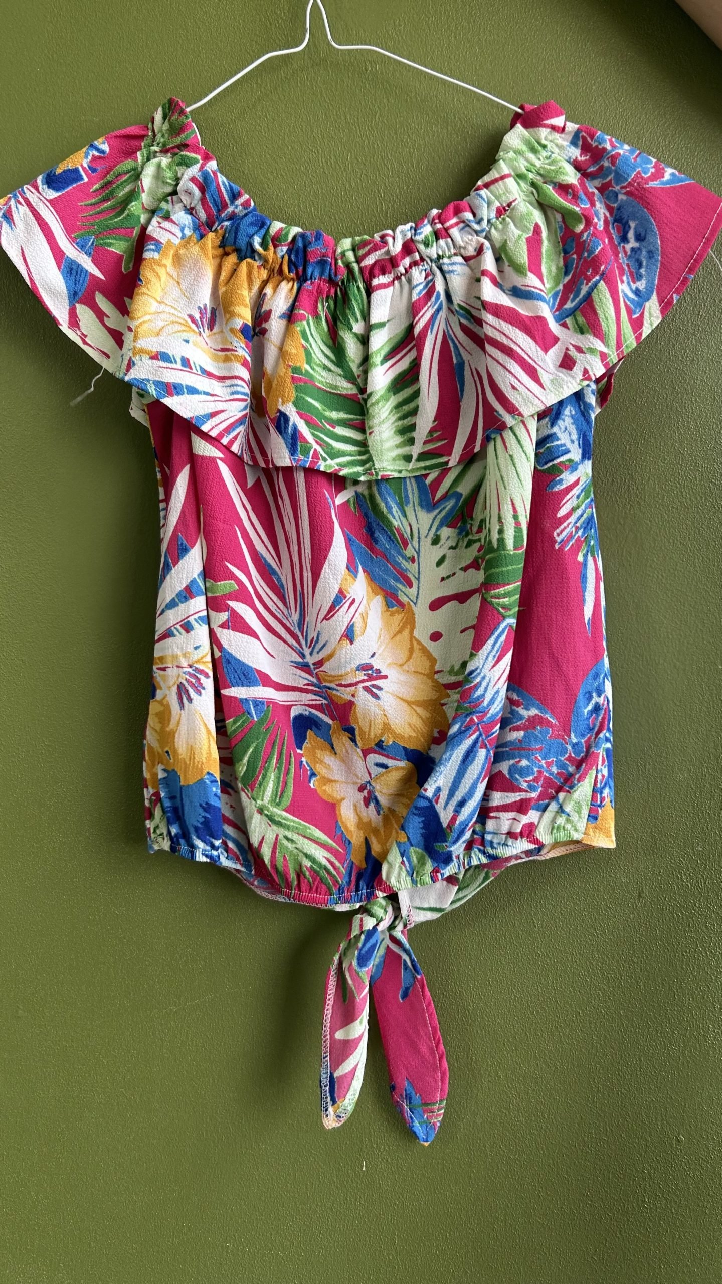 Blusa con flores hombros afuera Puede usarse arriba de hombros Tela fresca Ideal para playas, paseos, etc.