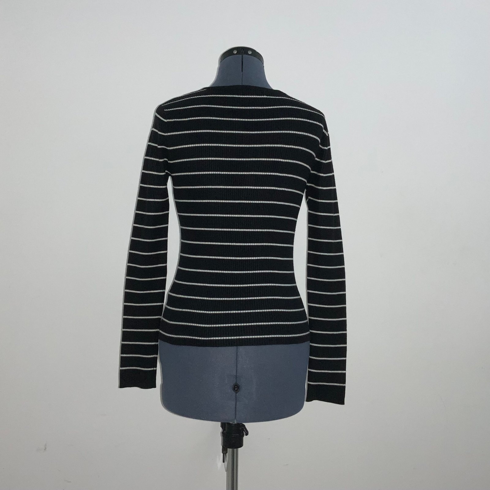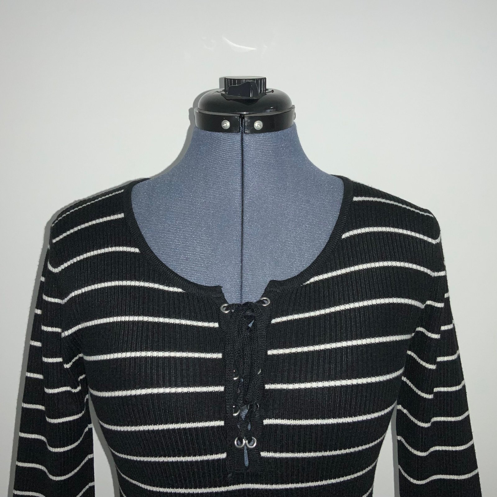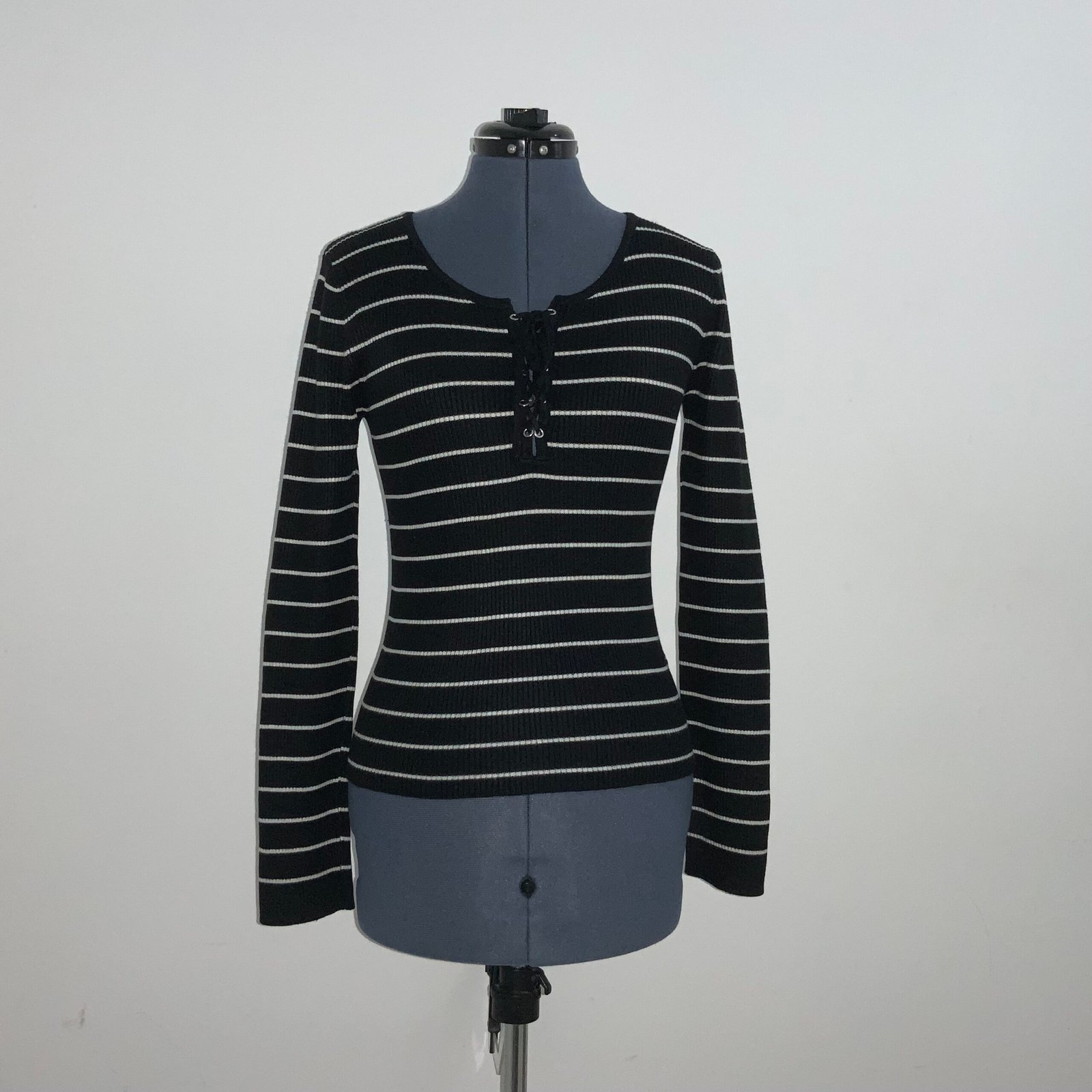 Blusa color negra con rayas horizontales (blancas), marca Forever 21. Con mangas largas, cuello redondo y abertura con cordones en la parte frontal de la prenda. Tela: De punto y stretch.