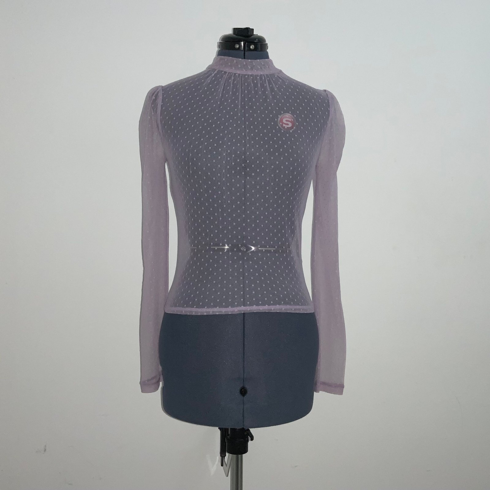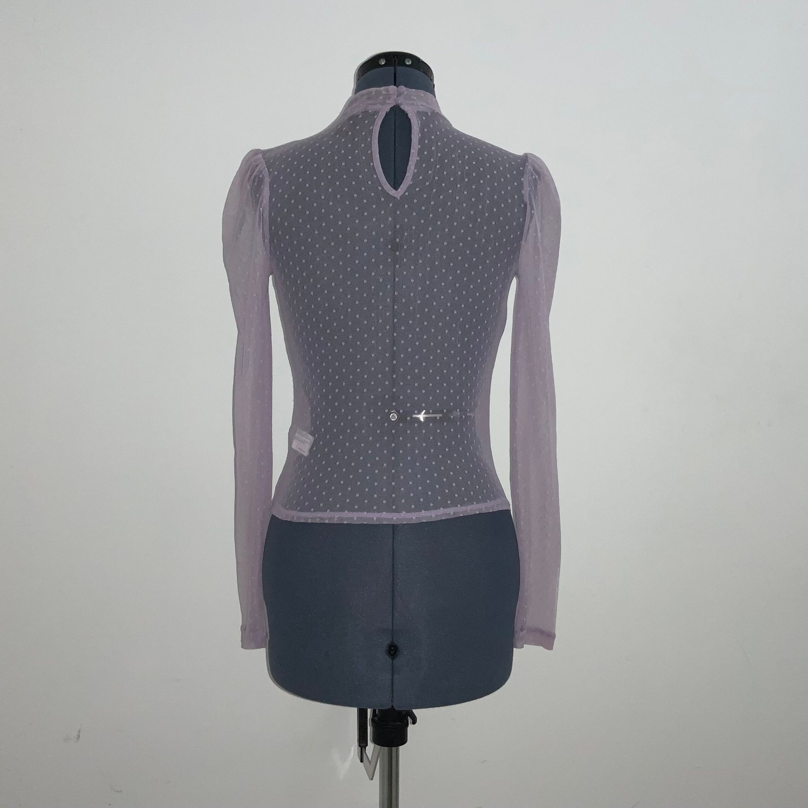 Blusa de malla color lila, marca Forever 21. Con cuello alto, mangas largas (abullonadas) y abertura en la parte de la espalda.