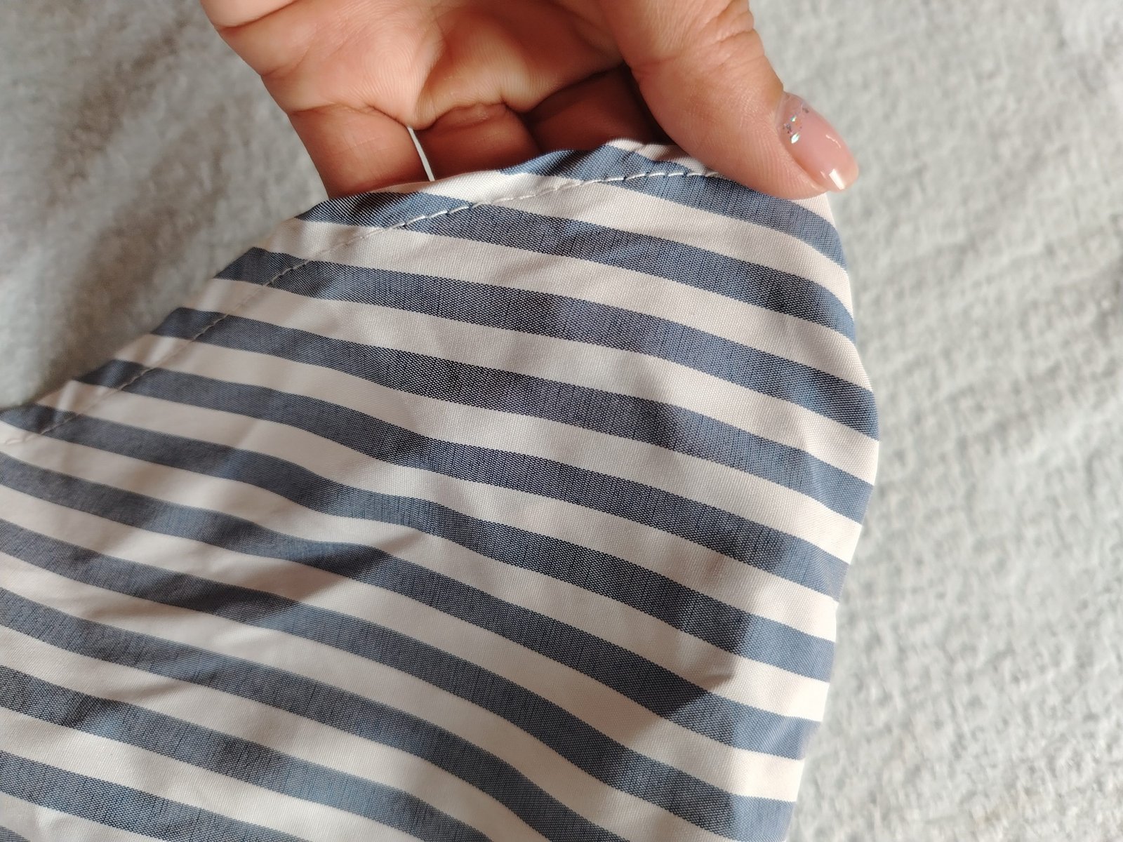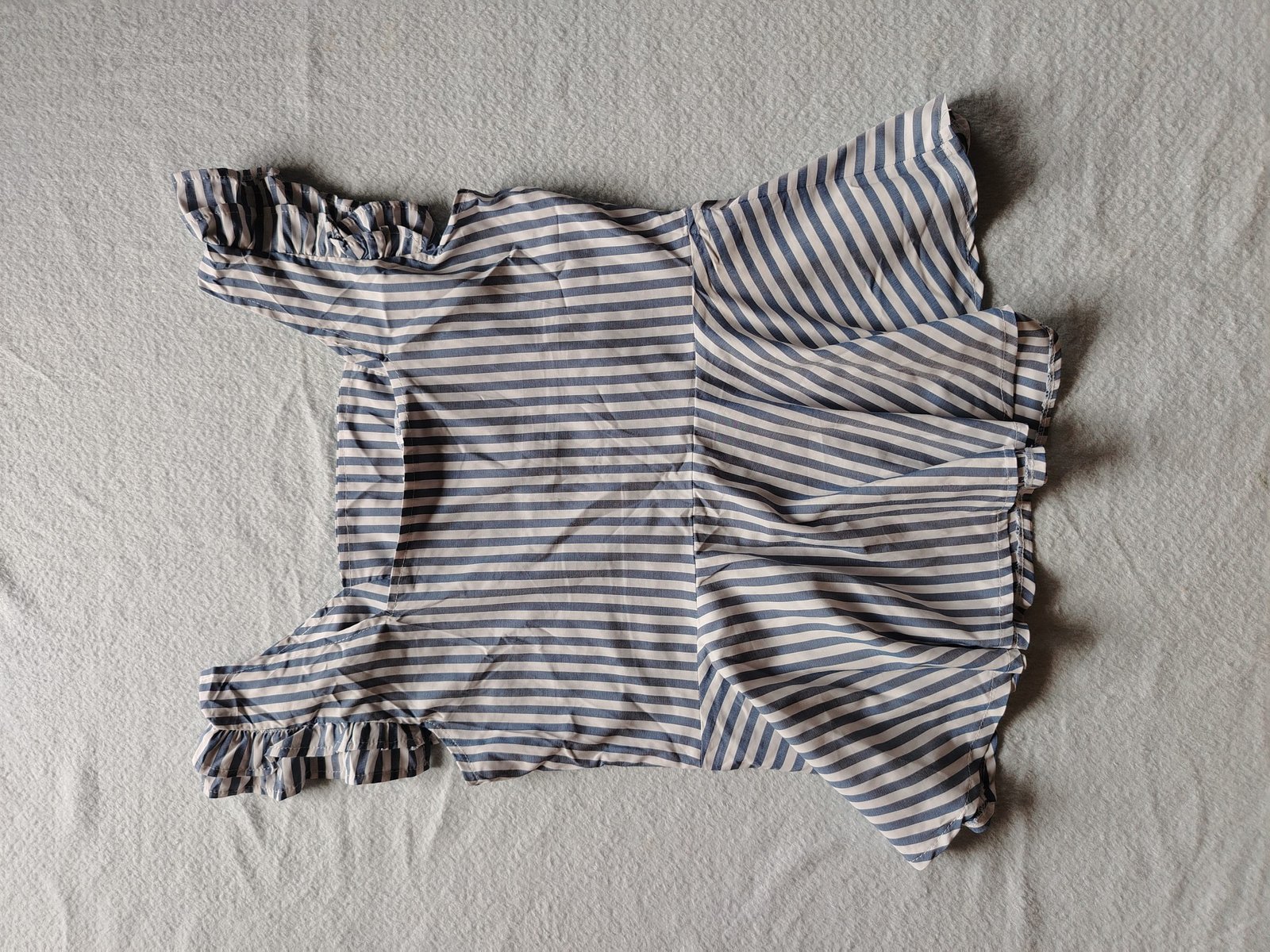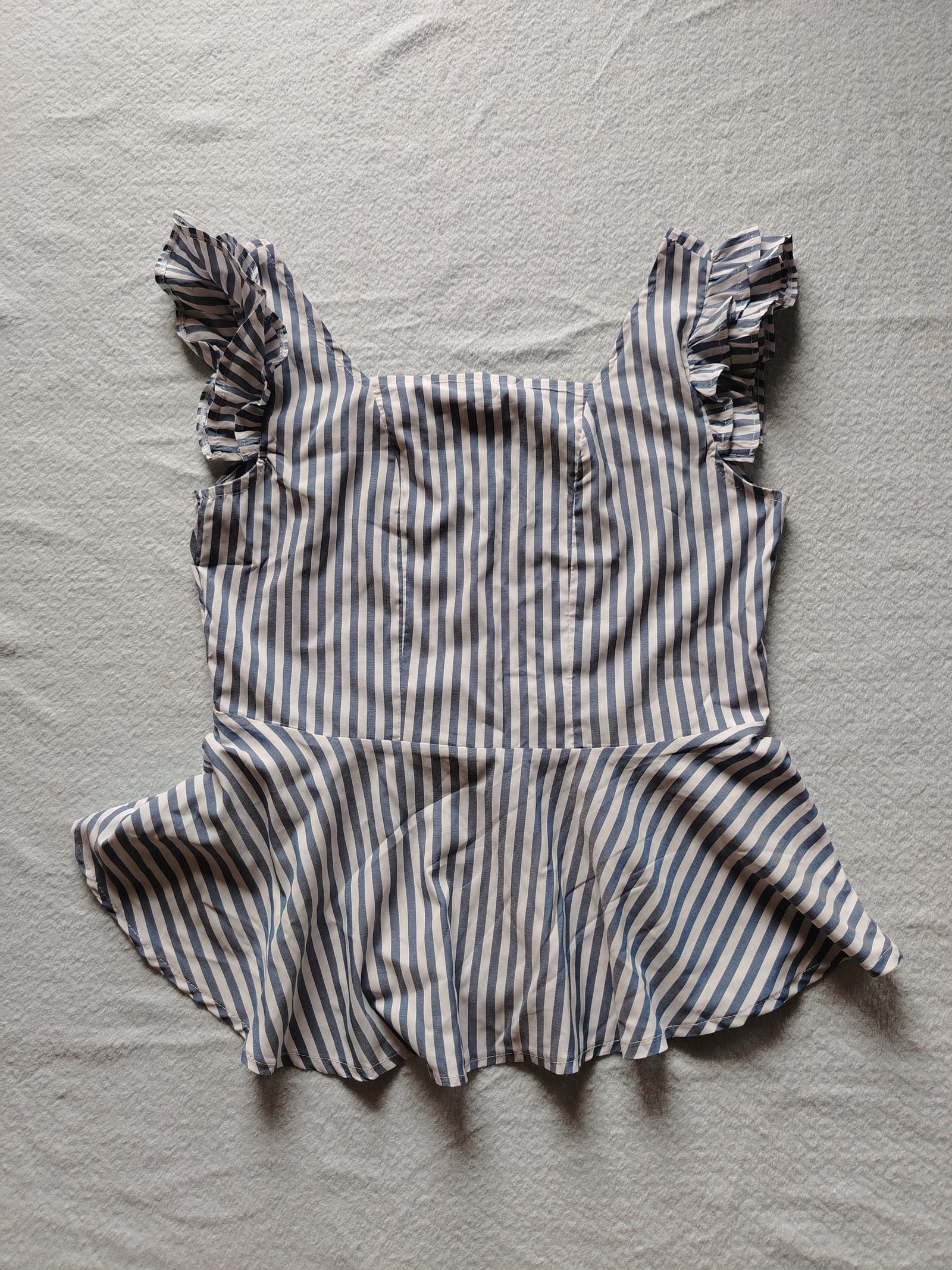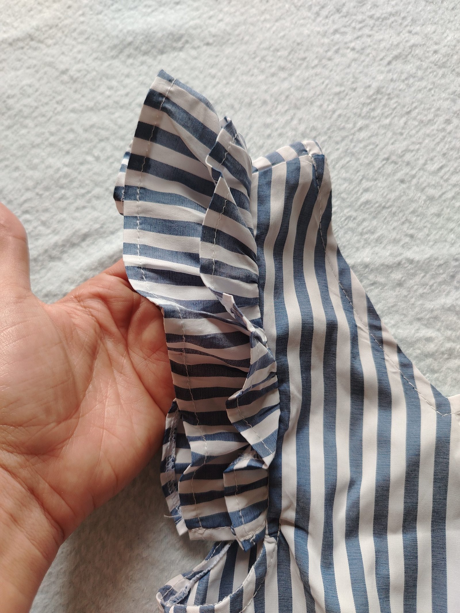 Blusa de rayas blanca y celeste acampanada de la cintura hacia la cadera y con mangas con pequeños vuelos, tela suave y fresca.