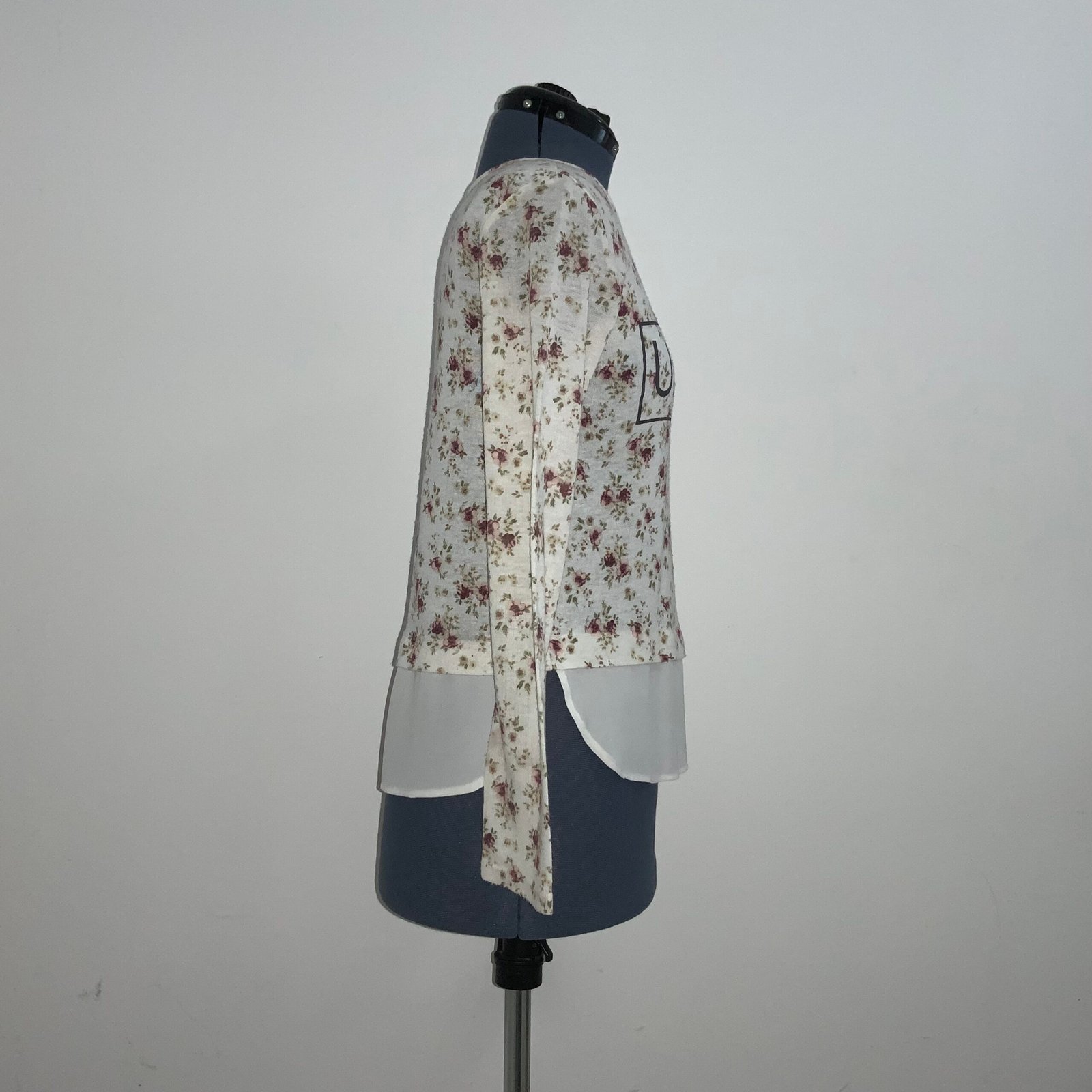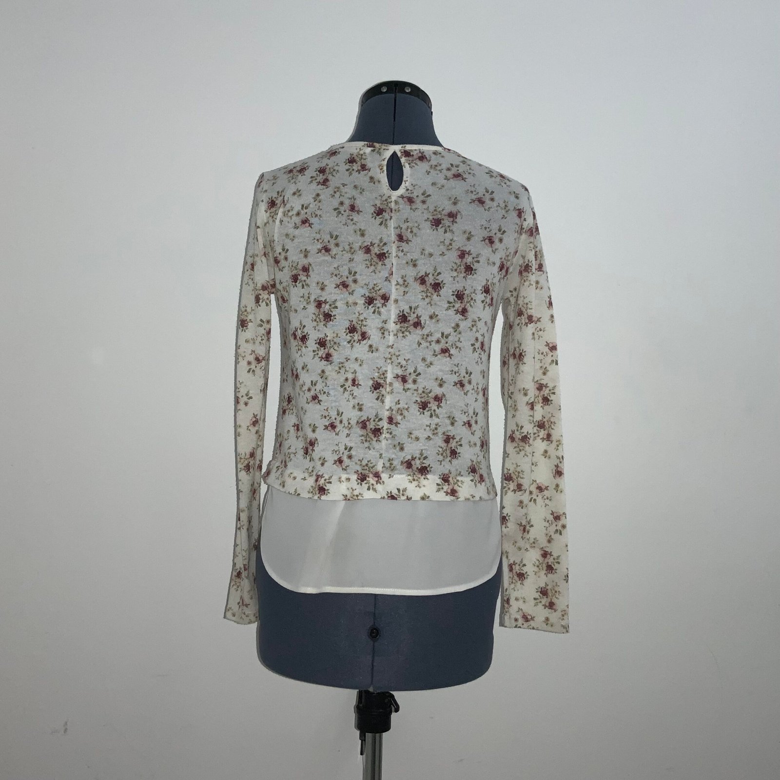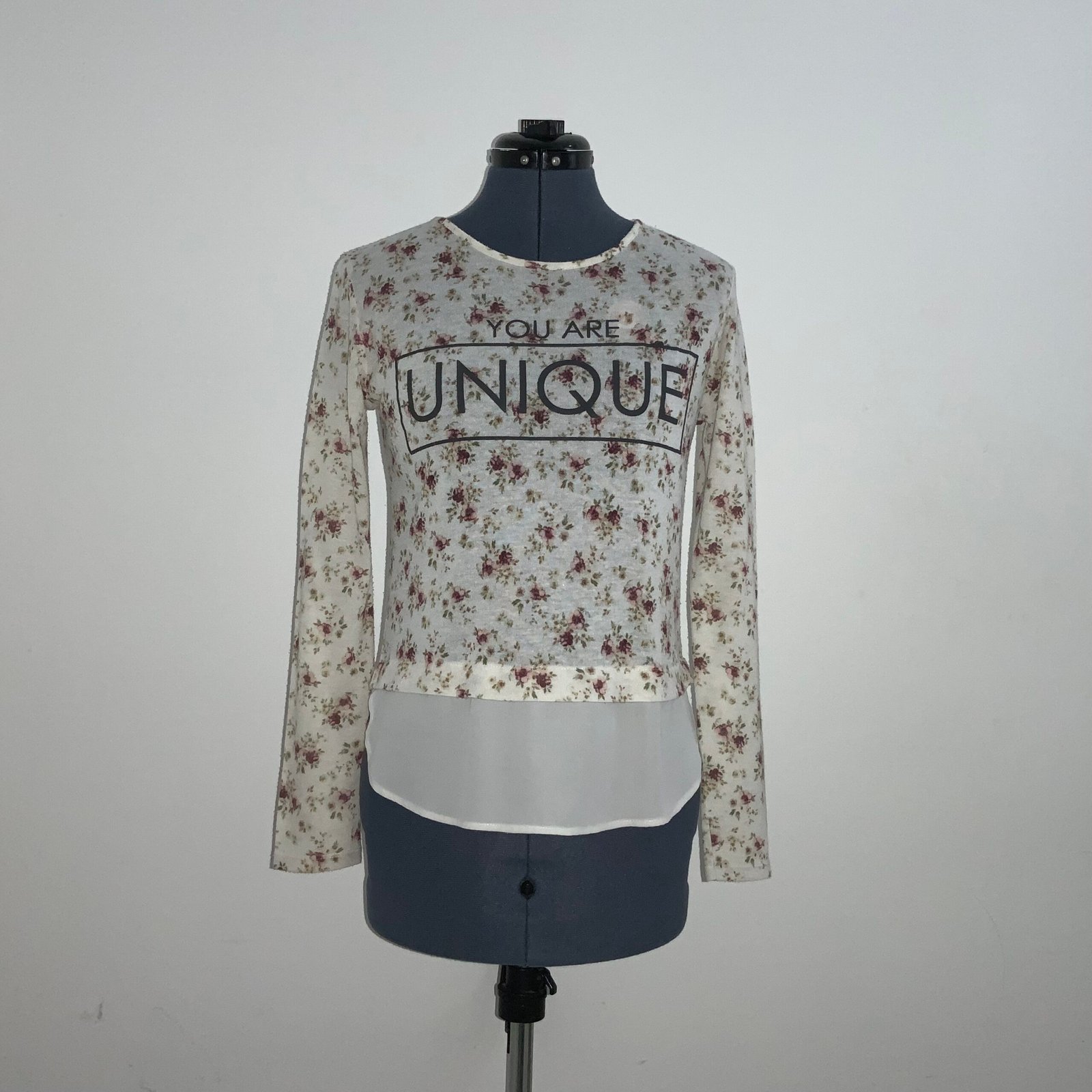 Blusa formal con estampado floral, marca Bershka. Con cuello redondo, mangas largas, leyenda estampada “You are Unique” y pequeña abertura en la parte de la espalda. Tela: De punto.