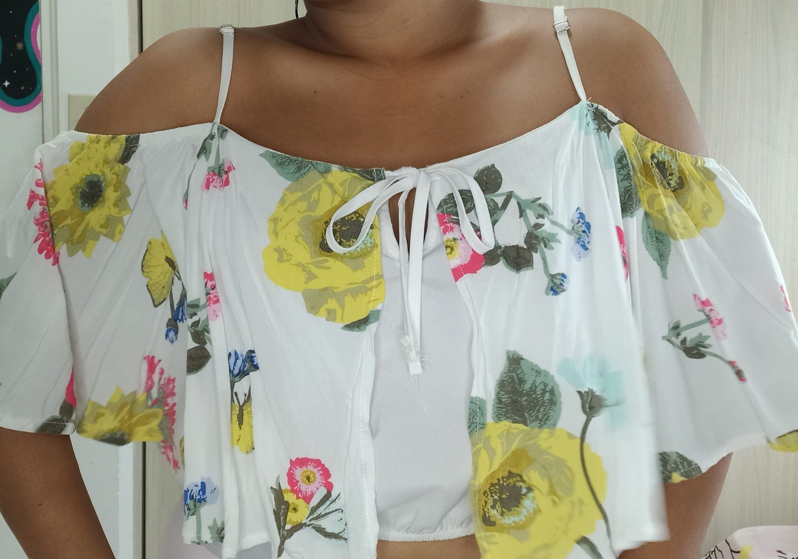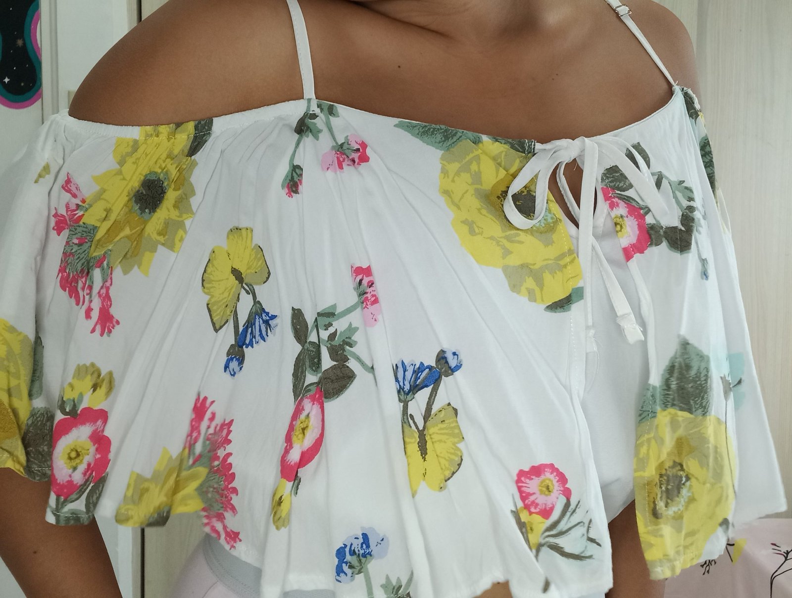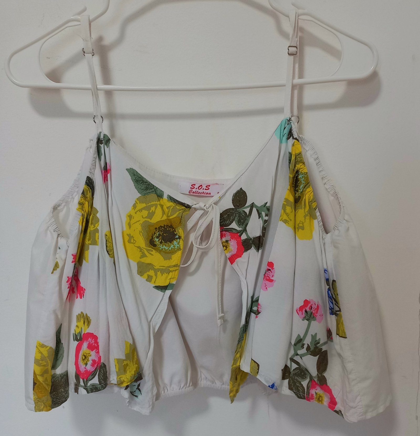 Blusa hombros afuera con estampado de flores en amarillo La blusa tiene una tela interna y otra que va alrededor de los hombros Tela delgada y fresca