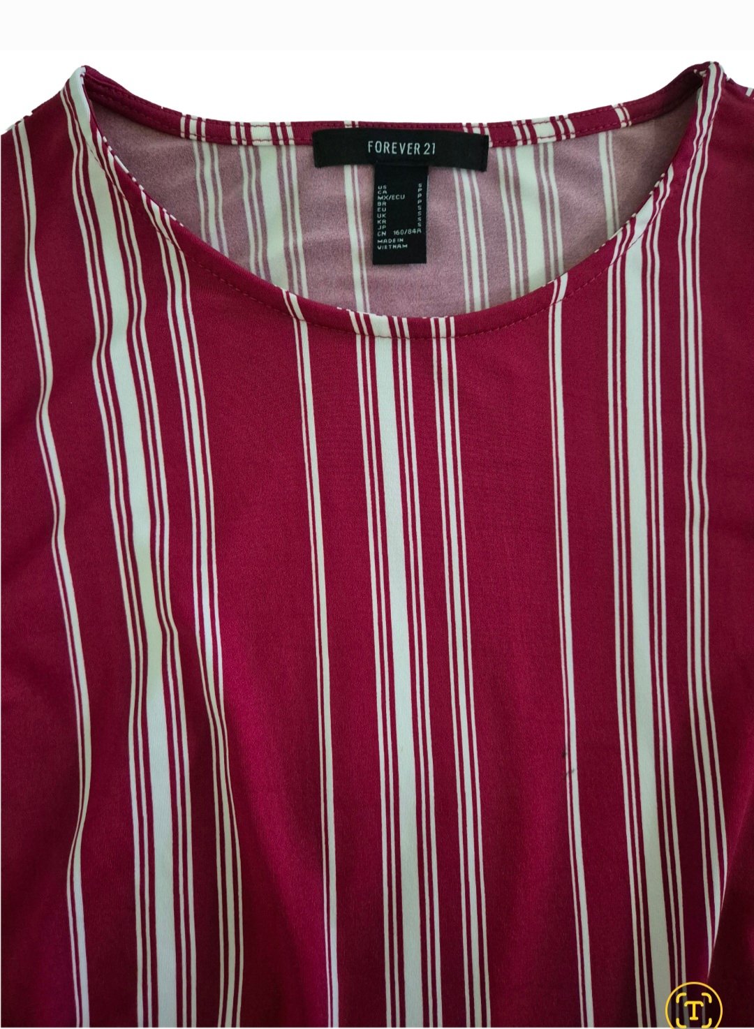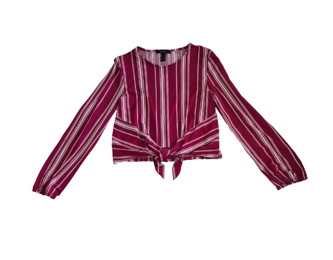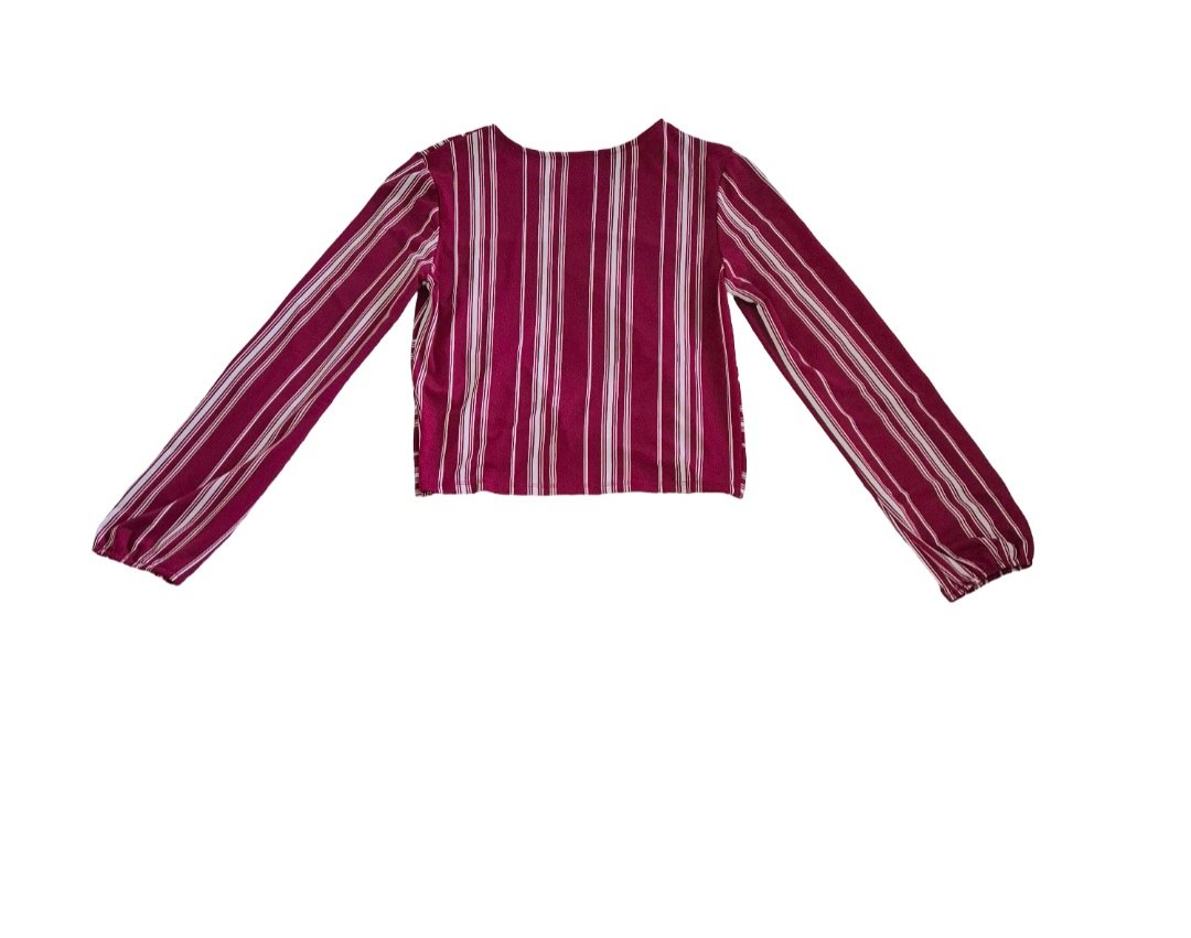 Blusa manga larga color rojo vino con rayas blancas con detalle de amarre en la cintura. Talla S