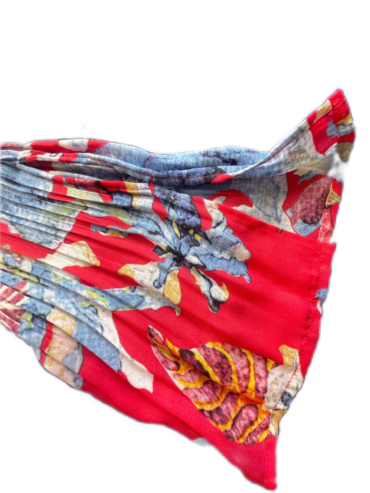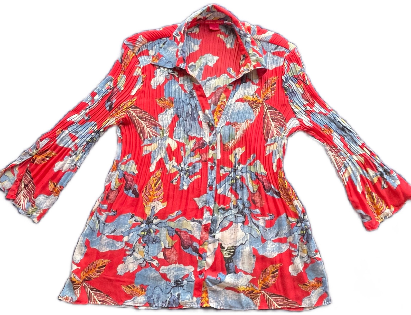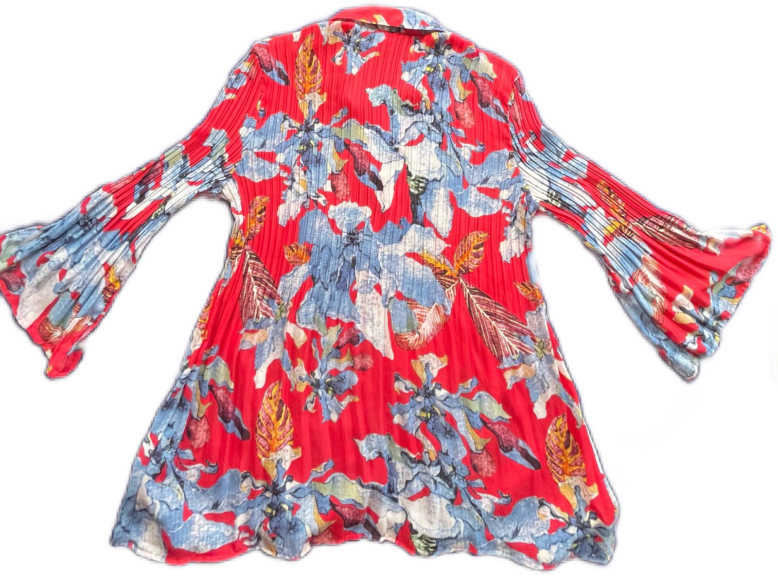 Blusa larga dama plegadiza color rojo con estampado. Mangas acampanadas Cuello V con botones Elegante para una ocasión especial Material: 100%polyester Usada una sola vez