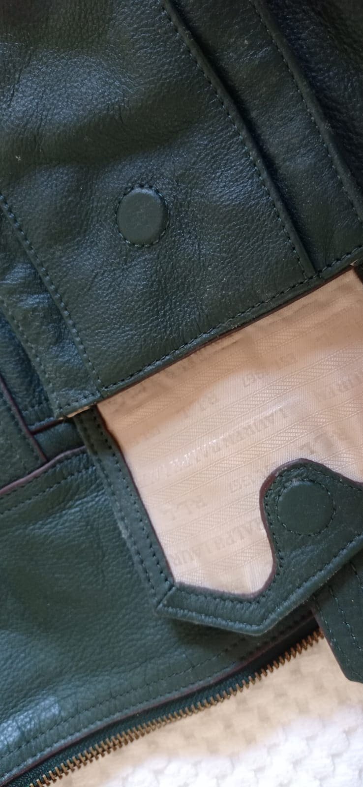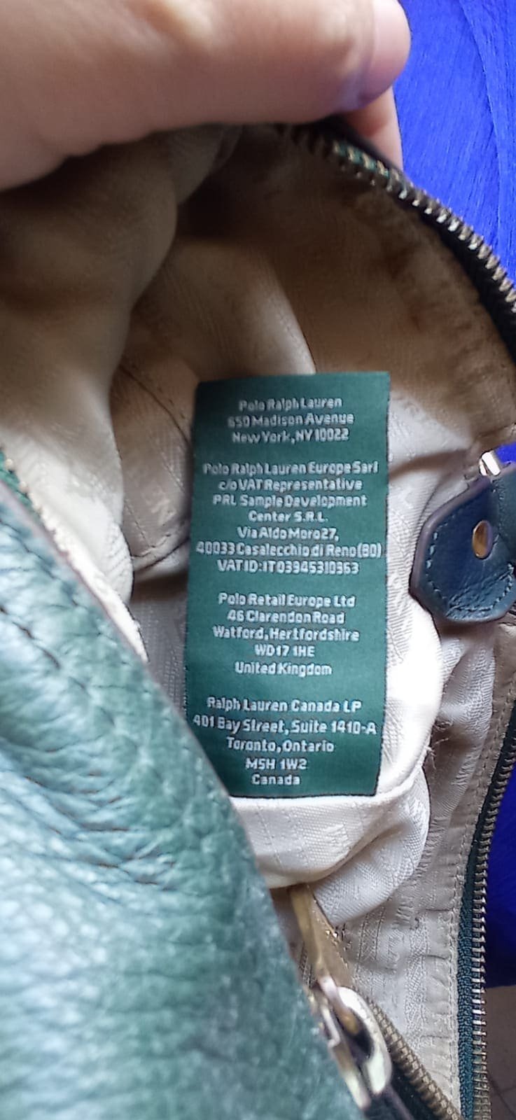 RALPH LAUREN Bermondsey Bolso de cuero verde En buen estado. Piel auténtica de grano granulado vintage. Verde (grado militar), herrajes dorados e con estampado RLL. Color tostado de la marca Forro interior. Bolsillo interior con zipper y dos bolsillos abiertos. Cuenta con bolsillos exteriores con cierre magnético. La bolsa se cierra con zipper en la parte superior para mantener seguros sus objetos de valor. Vístete casual o formal con este look elegante y con mucha clase que nunca pasa de moda. Este bolso es difícil de encontrar en este color y condición. Pieza de colección PD. Tiene detalles de uso. Pequeño huequito en el forro interno Es posible que el forro interior de la parte superior trasera necesite un poco de lavado.