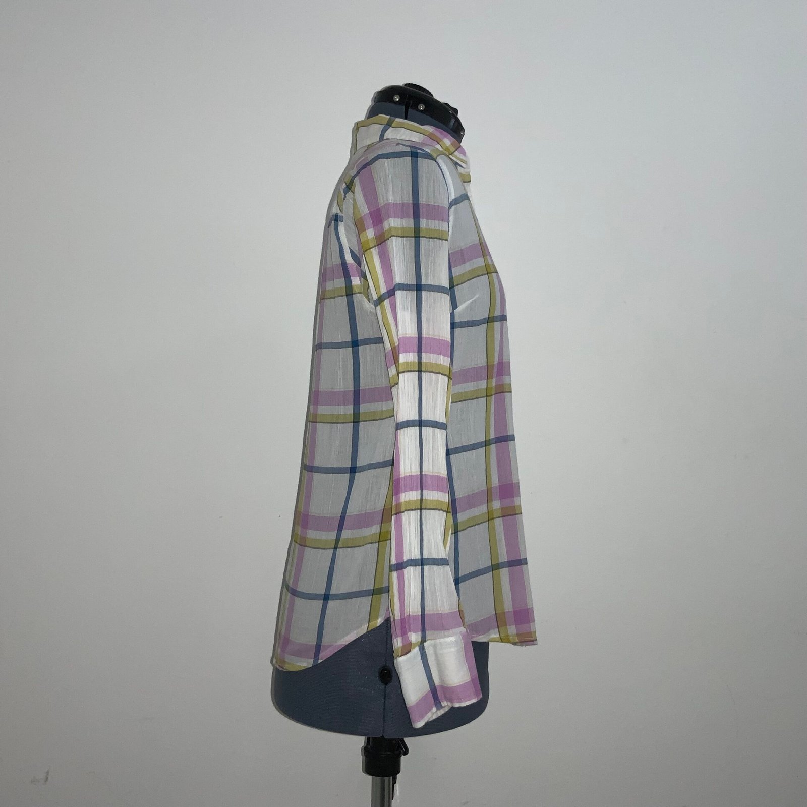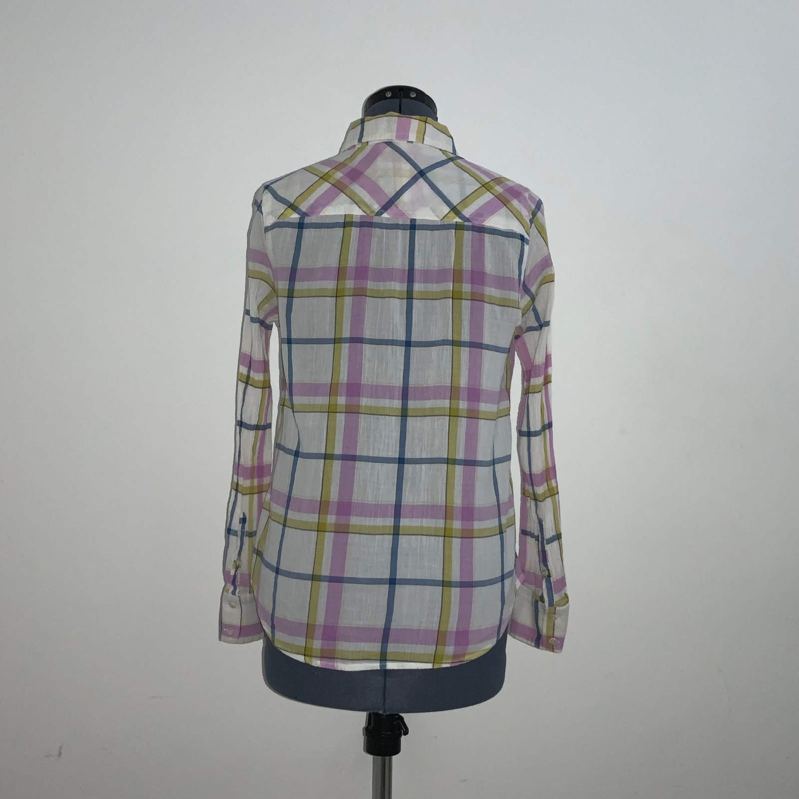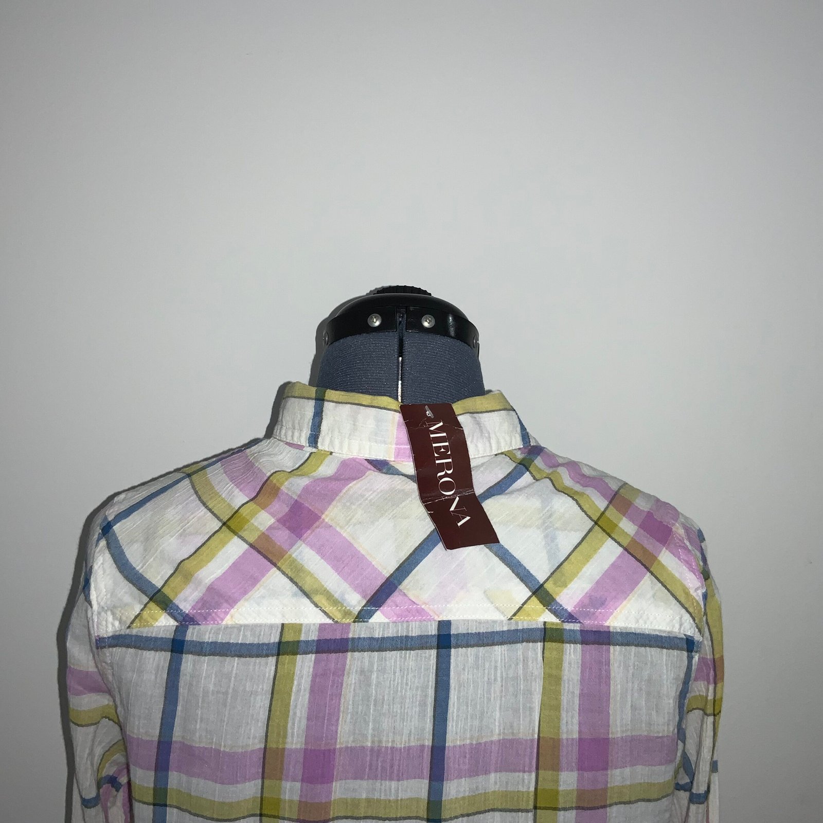 Camisa a cuadros (lila, mostaza, azul y crema), marca MERONA. Con cuello tipo americano, mangas largas, bolsillo y botones. Mantiene su etiqueta. Tela: 100% algodón.