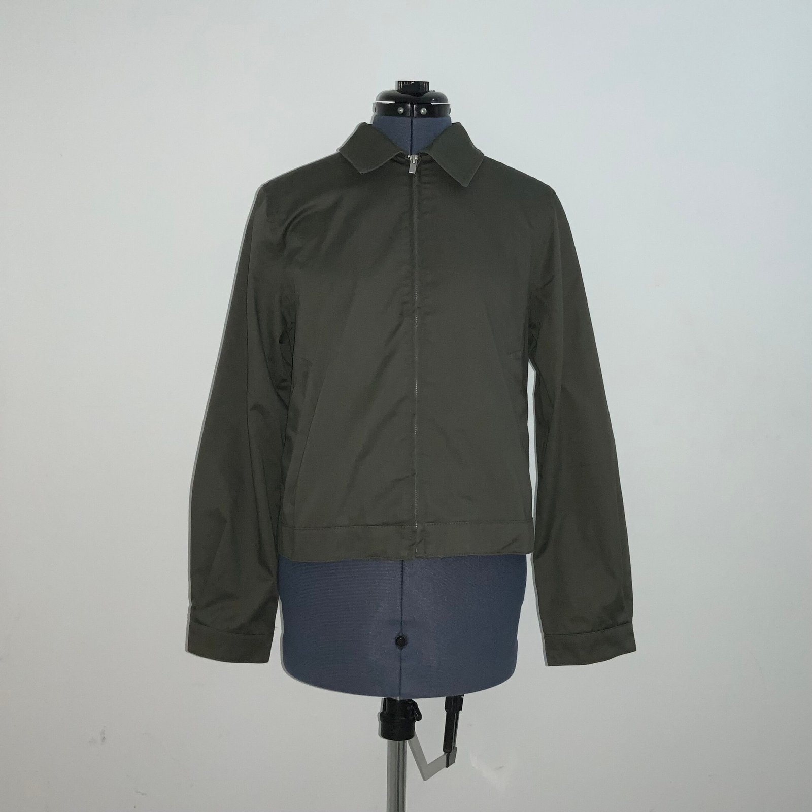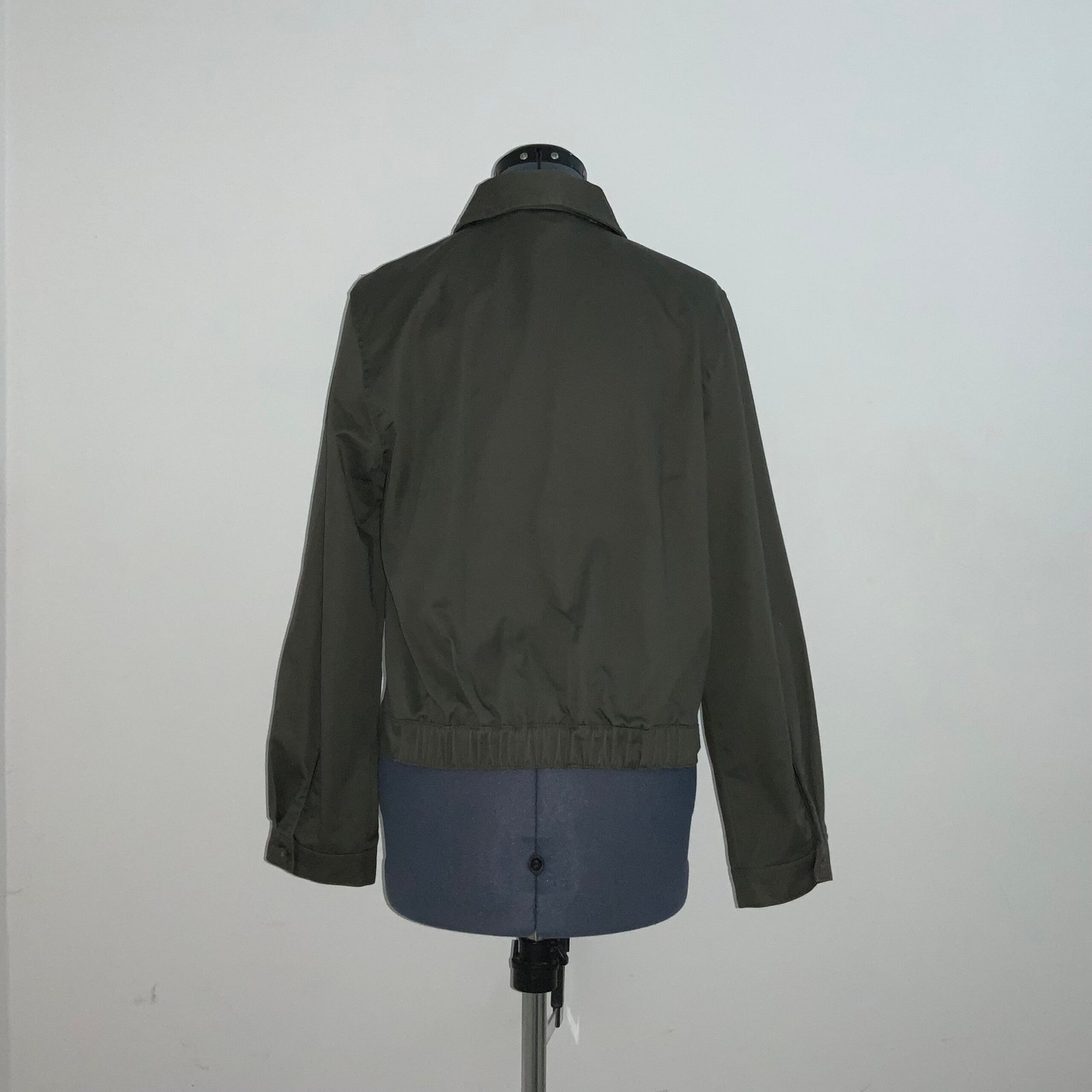 Chaqueta color verde militar, marca H&M. Con cuello polo, mangas largas con aberturas y botones, zipper delantero, bolsillos y elástico en la parte trasera de la cintura. Está confeccionada con forro en el interior de la prenda.