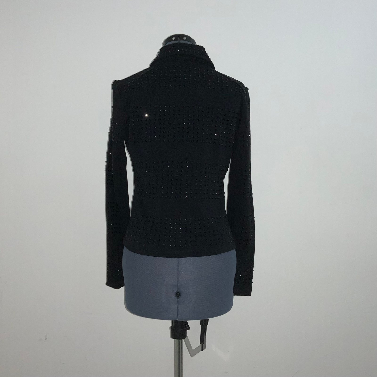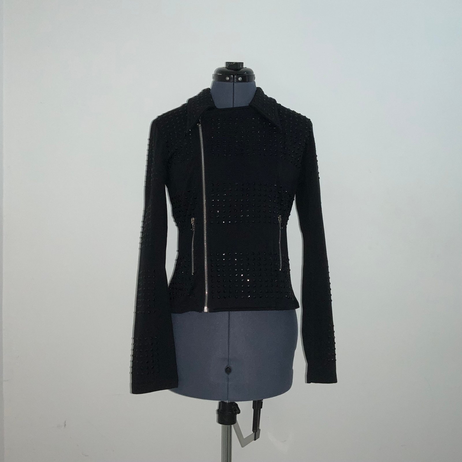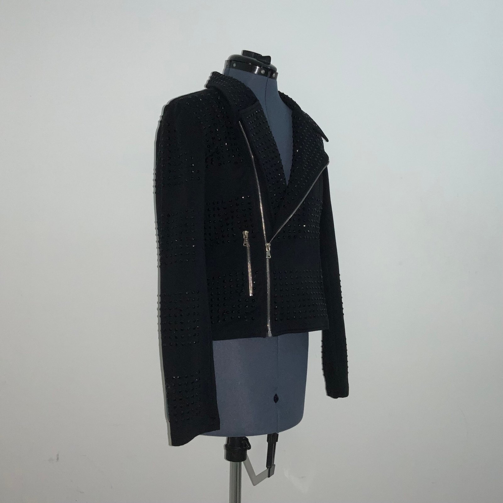Chaqueta color negra. Con cuello solapa, mangas larga, zipper en bolsillos y costado derecho y estoperoles en toda la prenda. Diseño moderno. Talla L (corre chica)