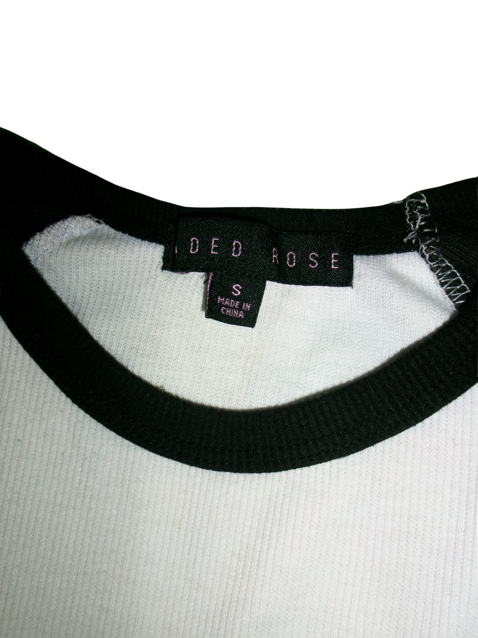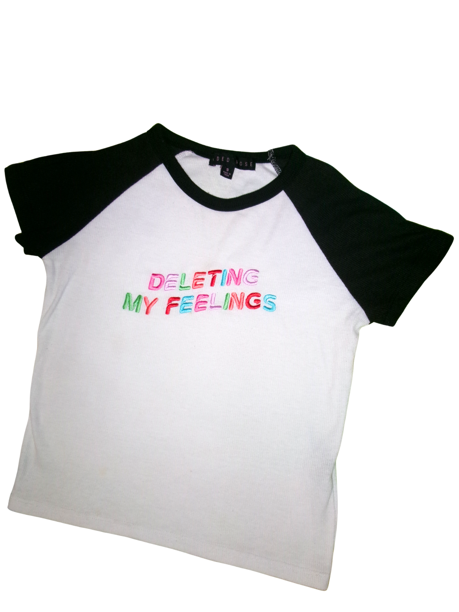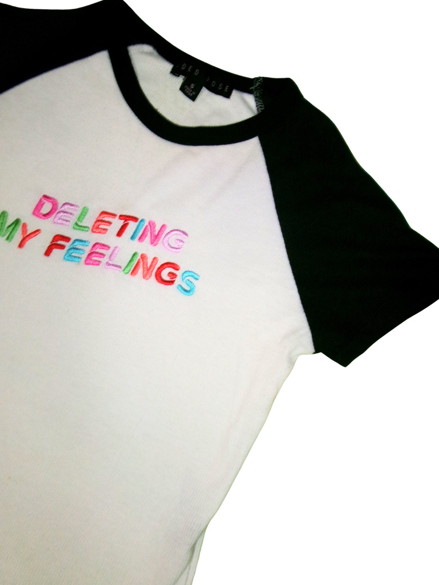 Crop top bicolor en blanco con mangas negras, súper cute y trendy. Destaca por su bordado multicolor con la frase “Deleting my feelings”, que le da un toque cool. Talla S.