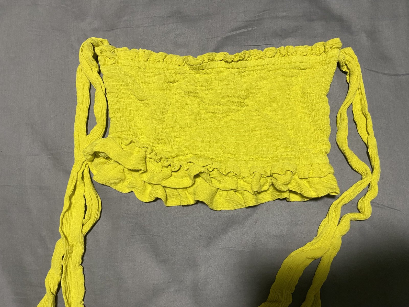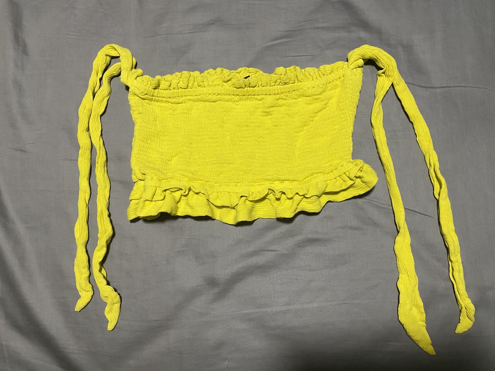 Crop top Verde/Amarillo pegado al cuerpo. Tiene tiras como mangas que las puedes colocar como desees, ya sea al hombro o debajo del hombro de manera horizontal o al cuello. Bastante practico y facil de combinar