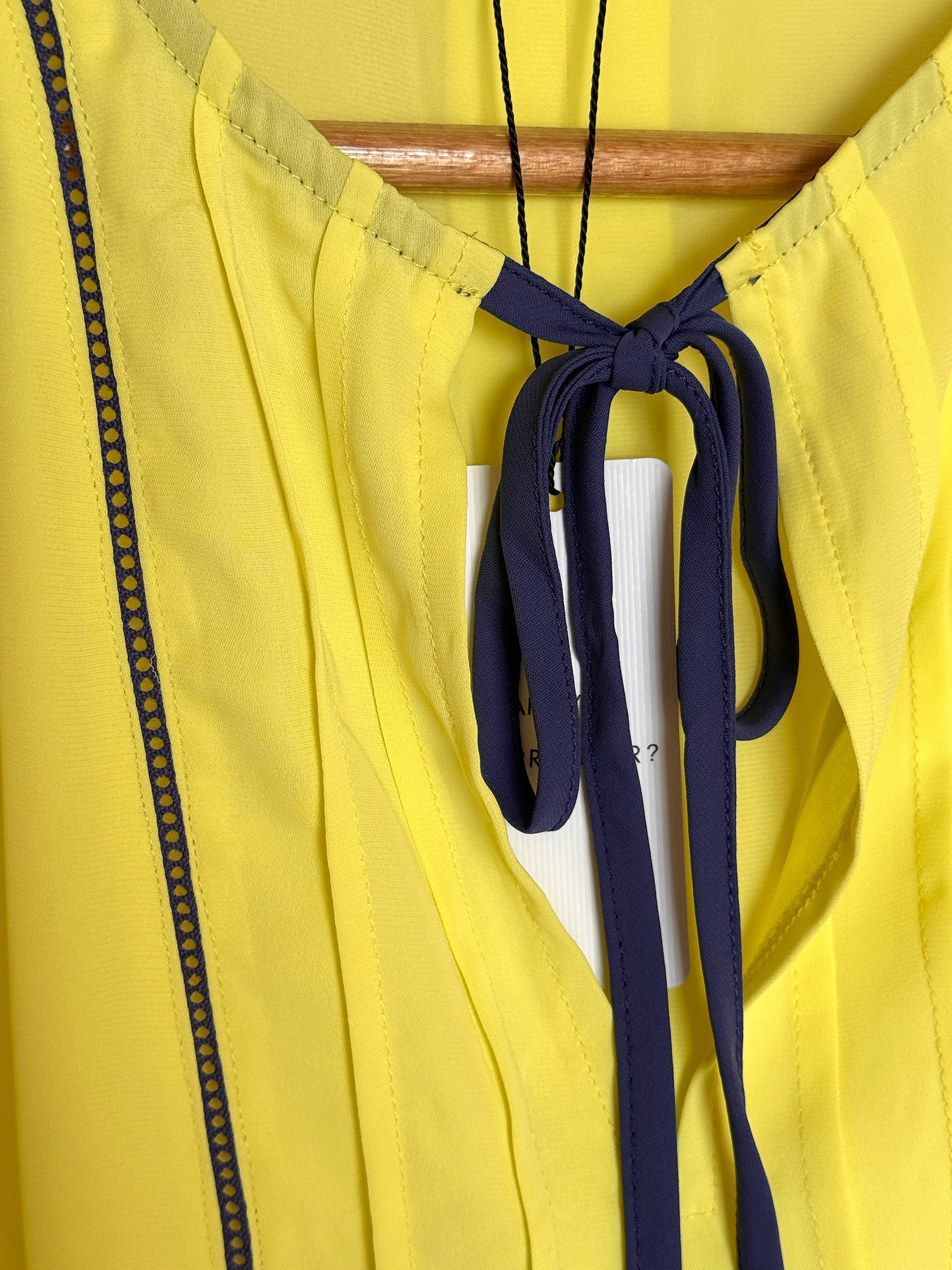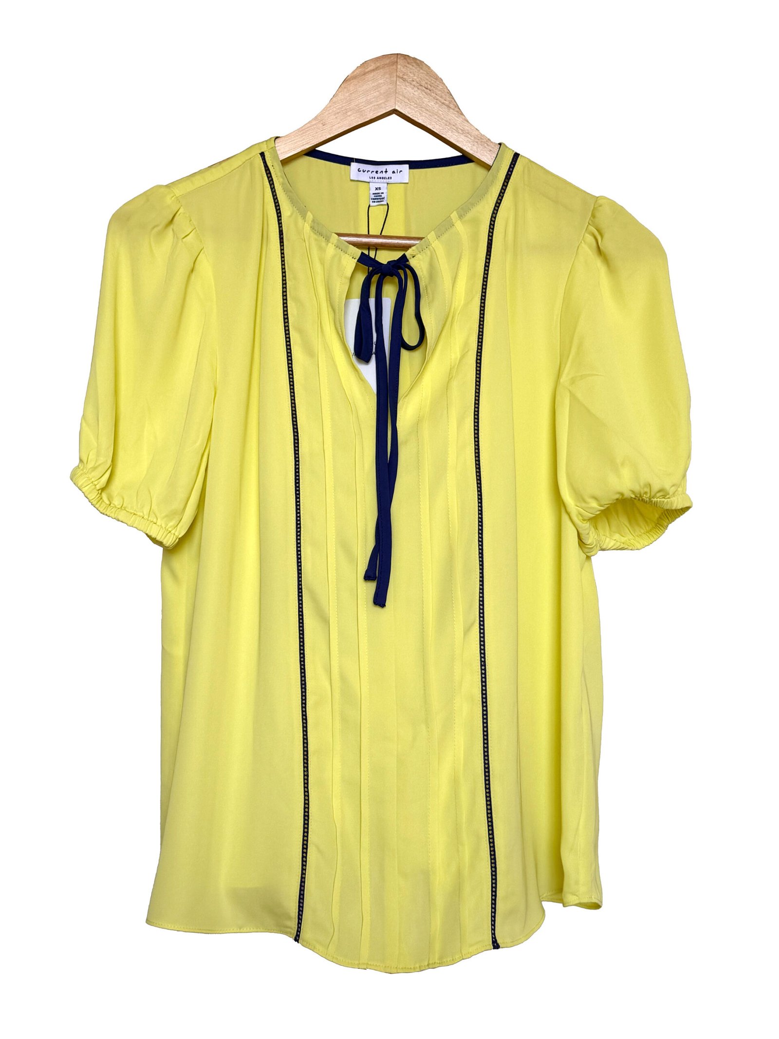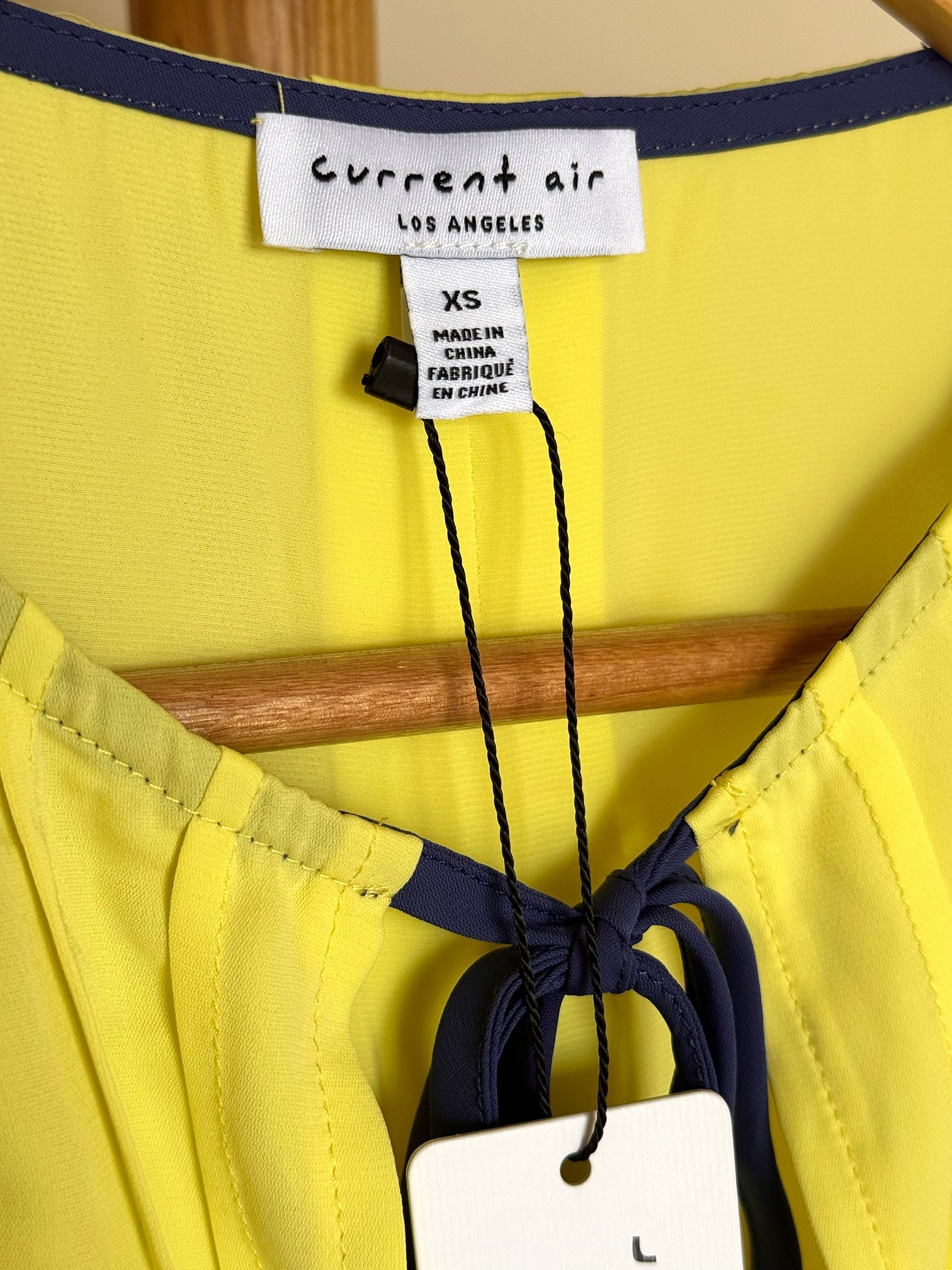 Top de la marca Current Air Los Ángeles en color verde neón claro; con cinta azul marino, detalles en la parte frontal y elástico en las mangas.