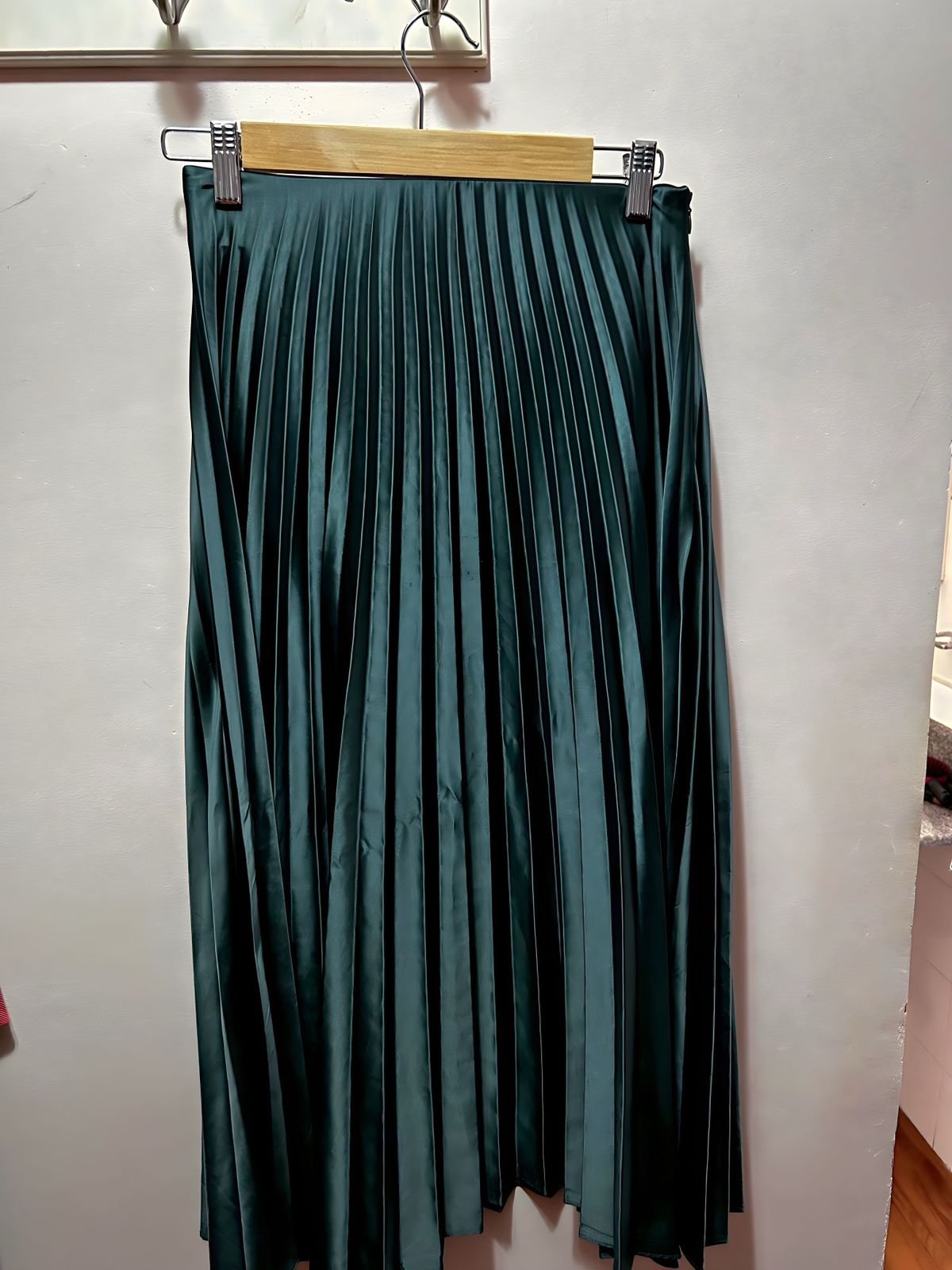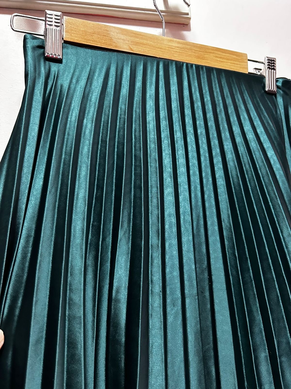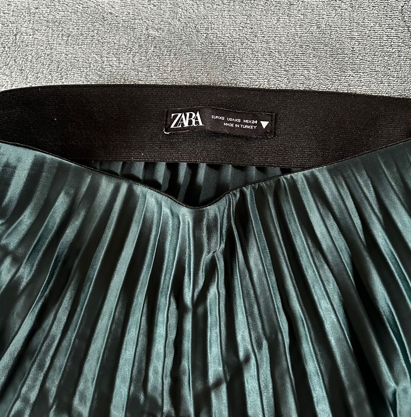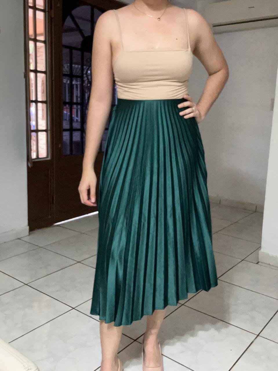 -Falda elegante de la marca Zara . Diseño plisado que aporta movimiento y elegancia. Tejido ligero y cómodo, ideal para cualquier temporada. Versátil para combinar con blusas, camisetas o suéteres. Perfecta para ocasiones casuales o eventos especiales. -Usado como nuevo. -En la cintura cuenta con elástico para que se adapte mejor a tu cintura, también cuenta con zipper en la zona lateral estilizando tu cuerpo. – Es talla XS pero también talla S por la flexibilidad del elástico en la cintura.