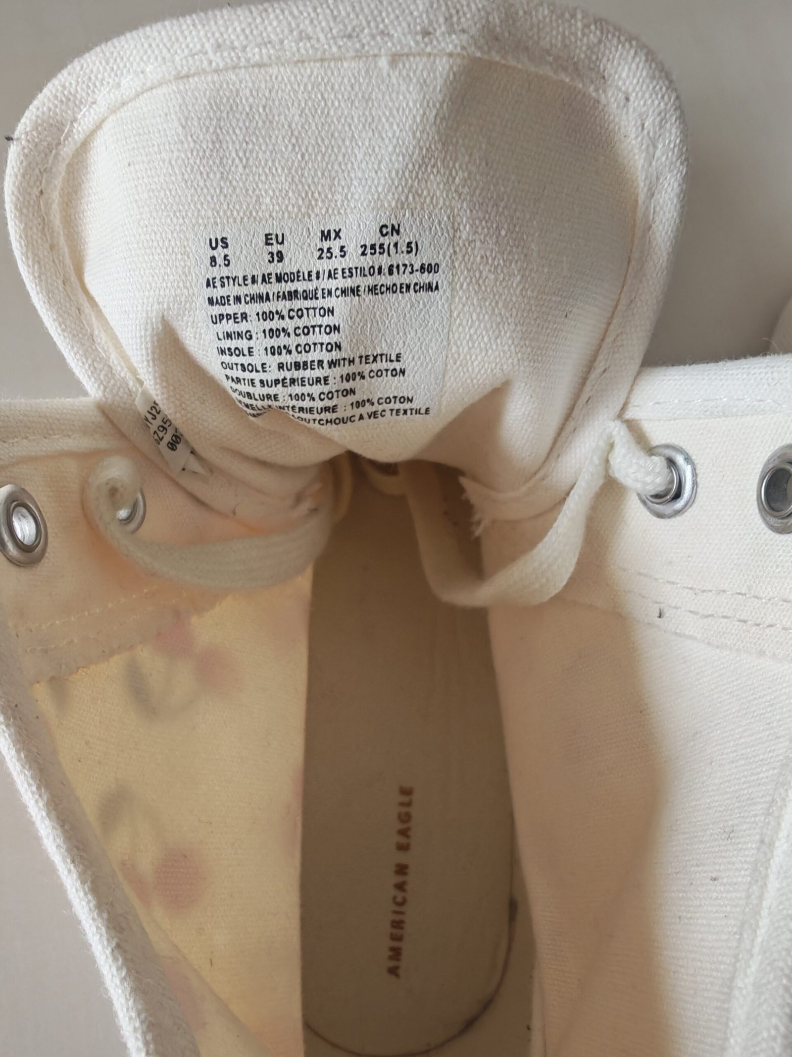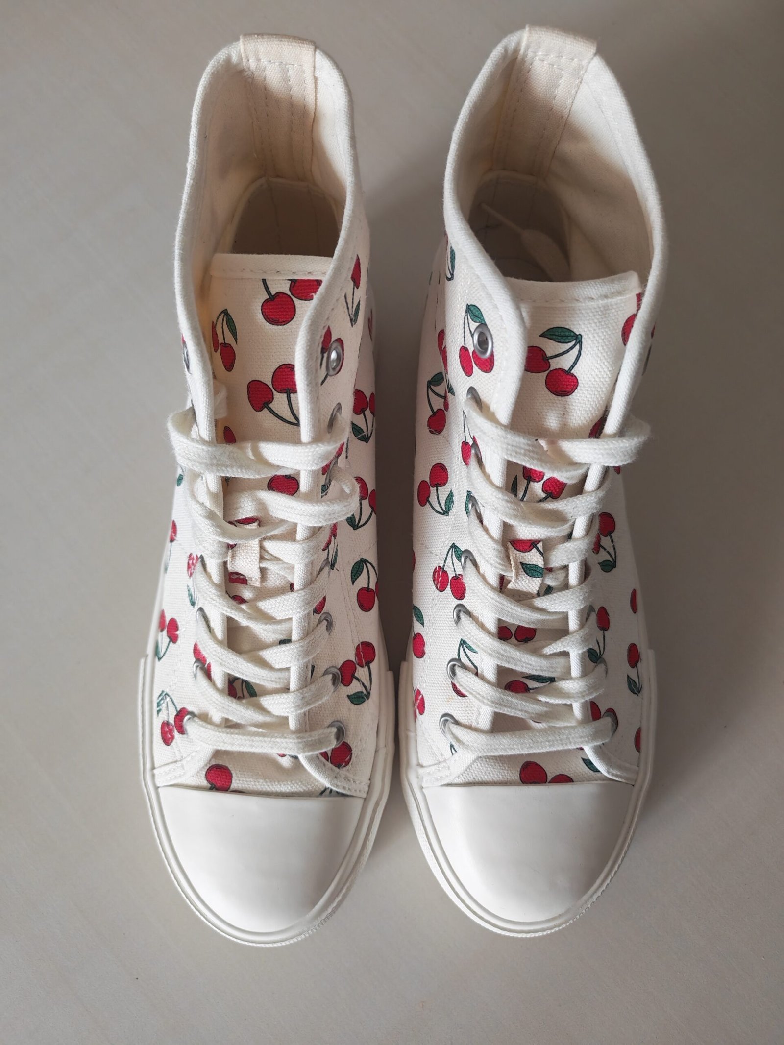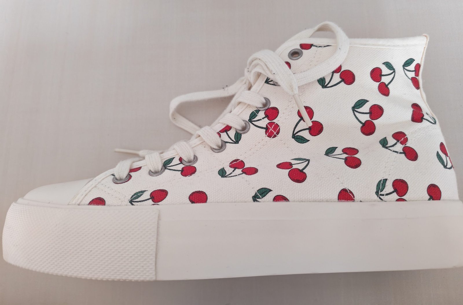 Zapatillas tipo “High T0p” en color blanco, con print de cerezas, marca American Eagle. Talla 8.5