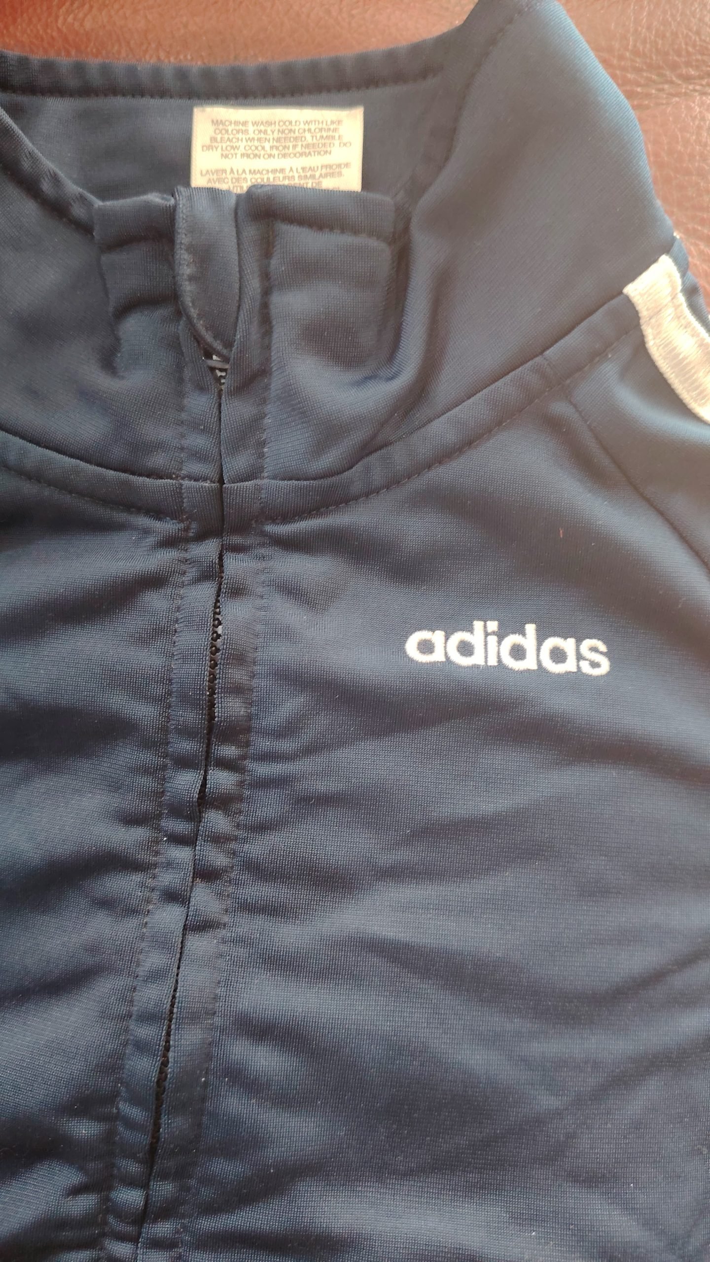 Jacket marca Adidas color azul marino con líneas blancas el jacket cuenta con un zipper en el medio que funciona excelente. Talla 3T