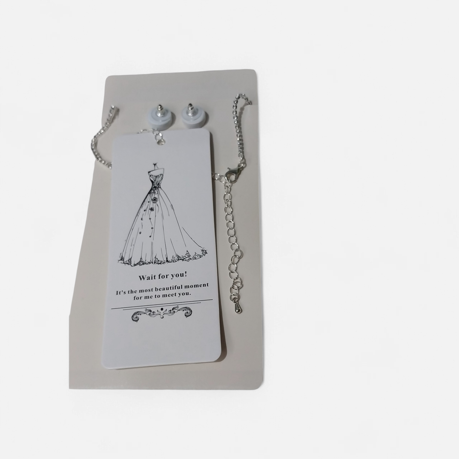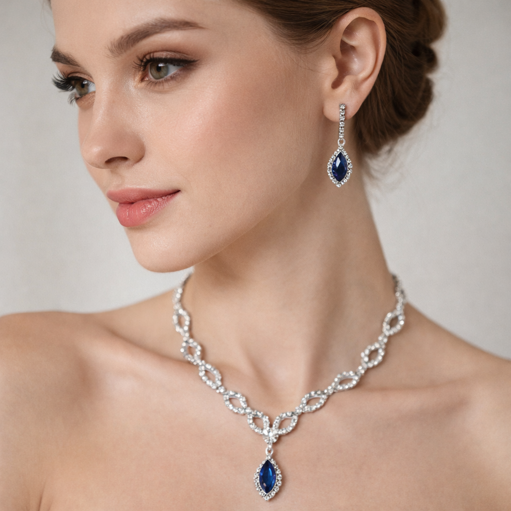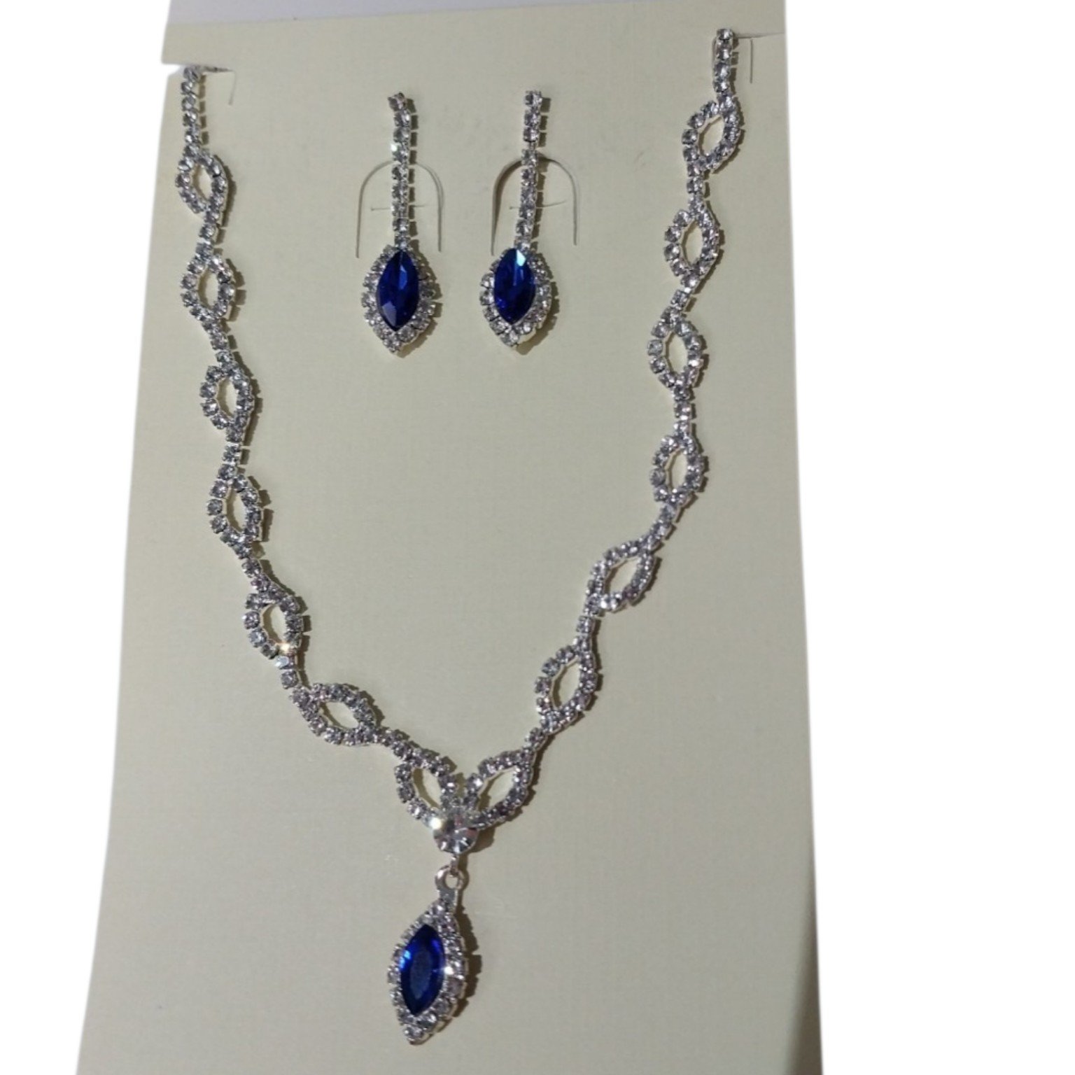 Elegante conjunto de joyería plateado formado por una cadena de óvalo con piedras brillantes, con colgantes en una decorado de piedra azul, es el complemento perfecto para un vestido de noche.