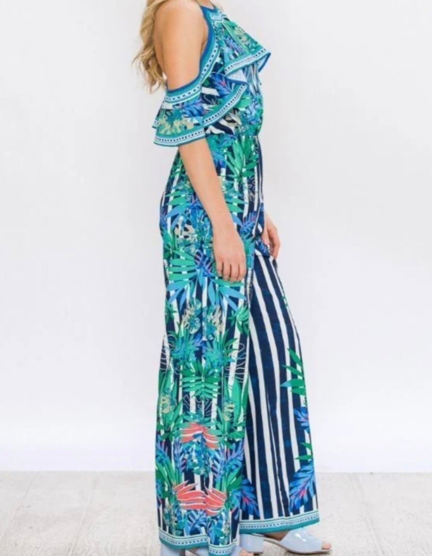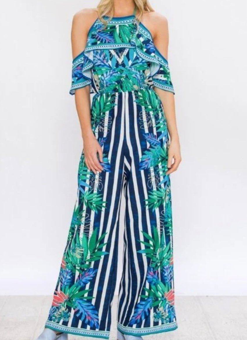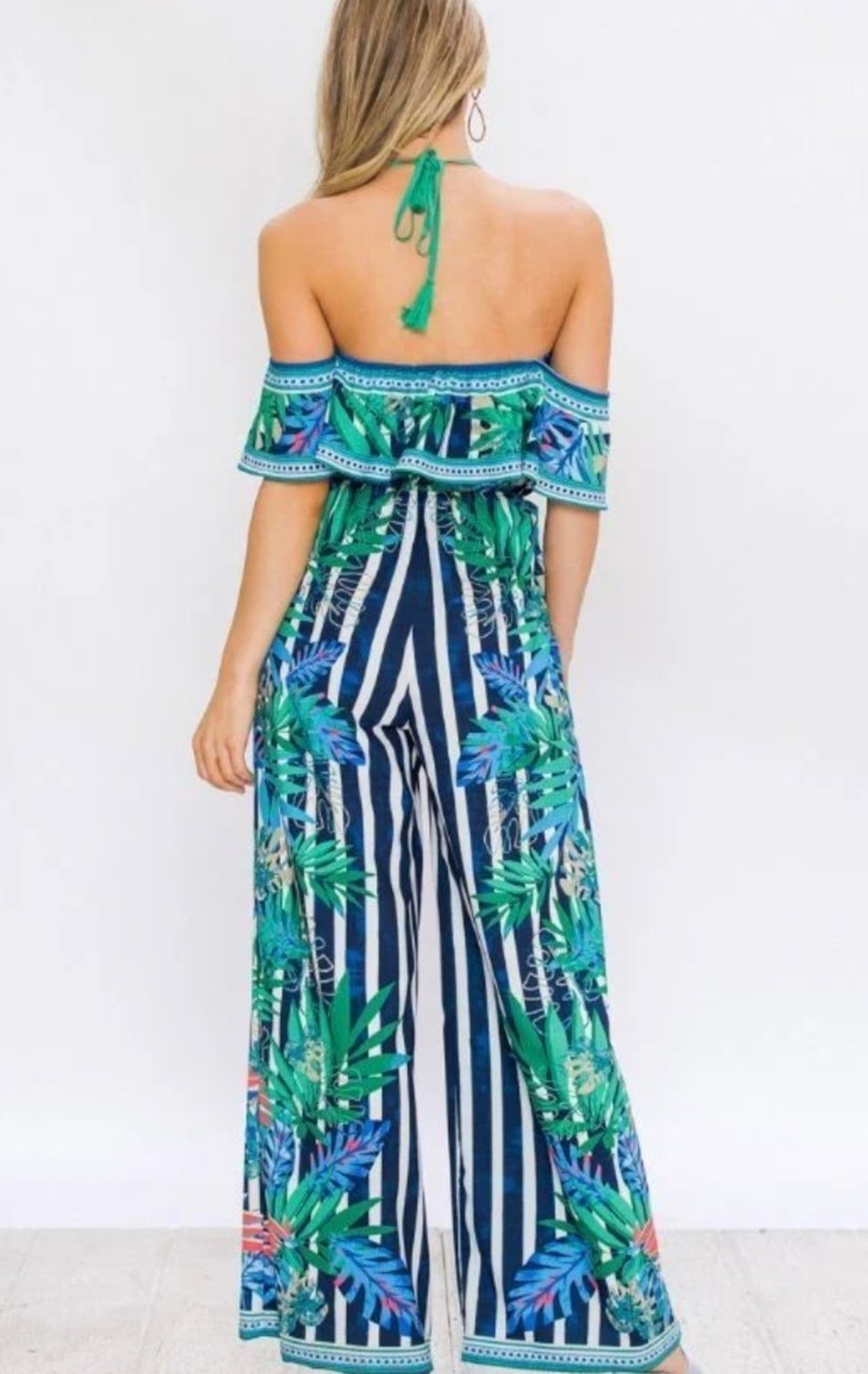 Jumpsuit Tropical con hombros descubiertos y arandela