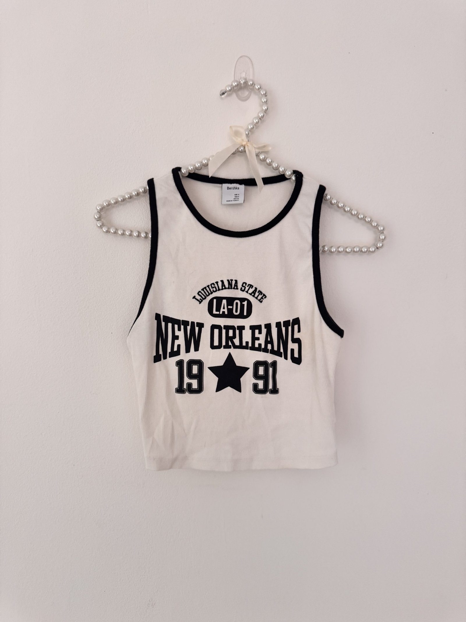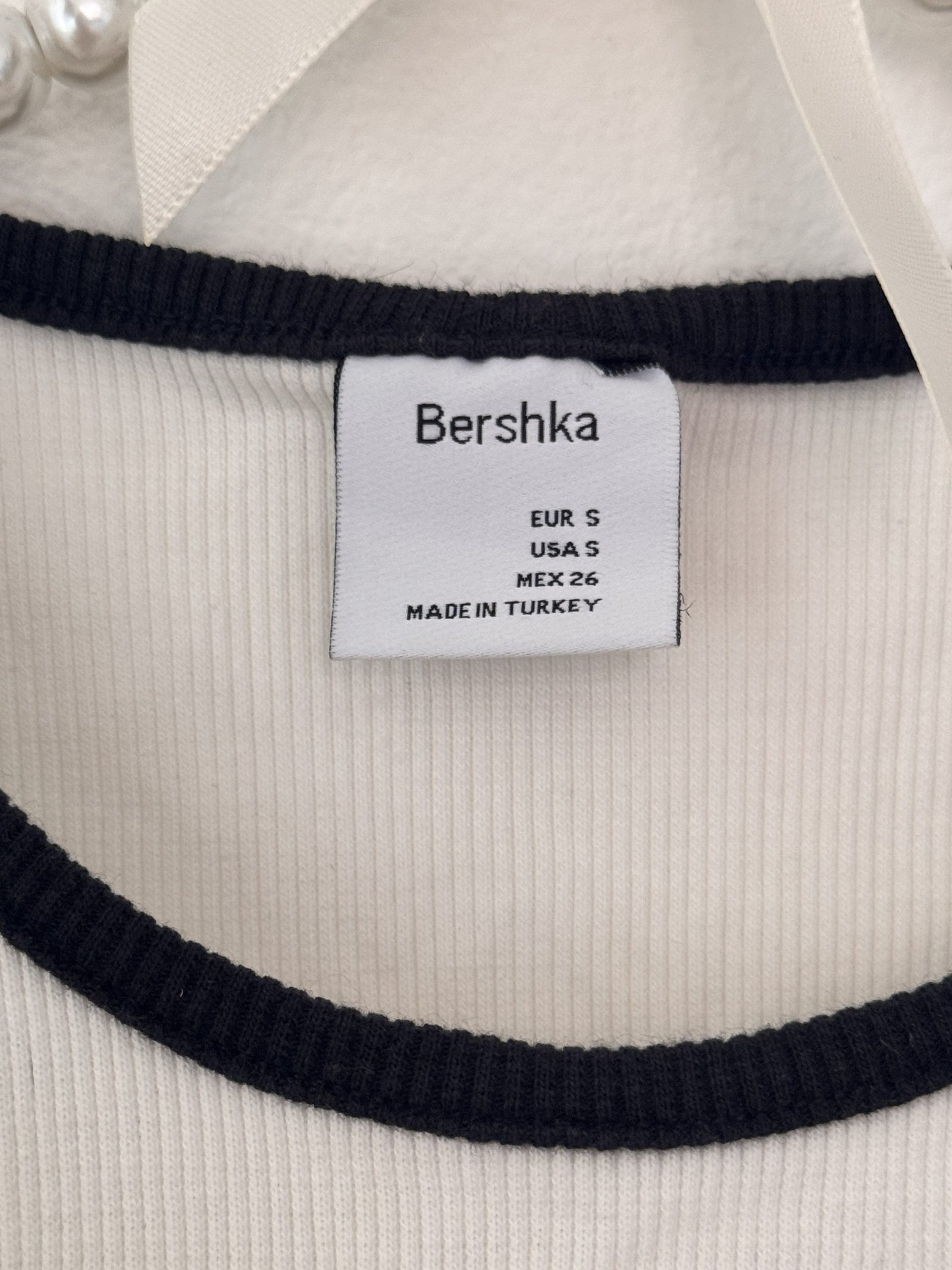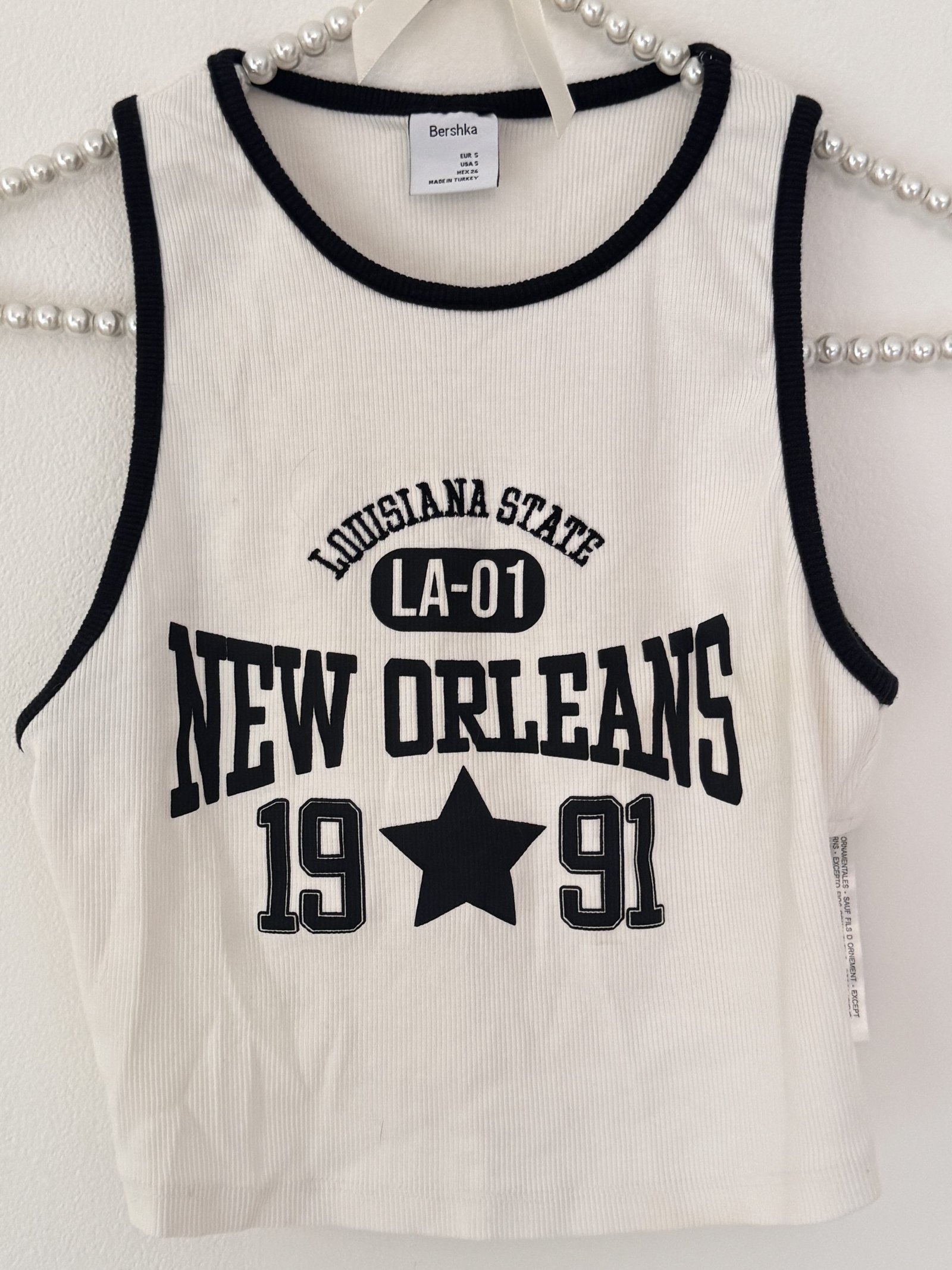 Es un top de la marca bershka, blanco con letras negras, talla S, con uso de una vez