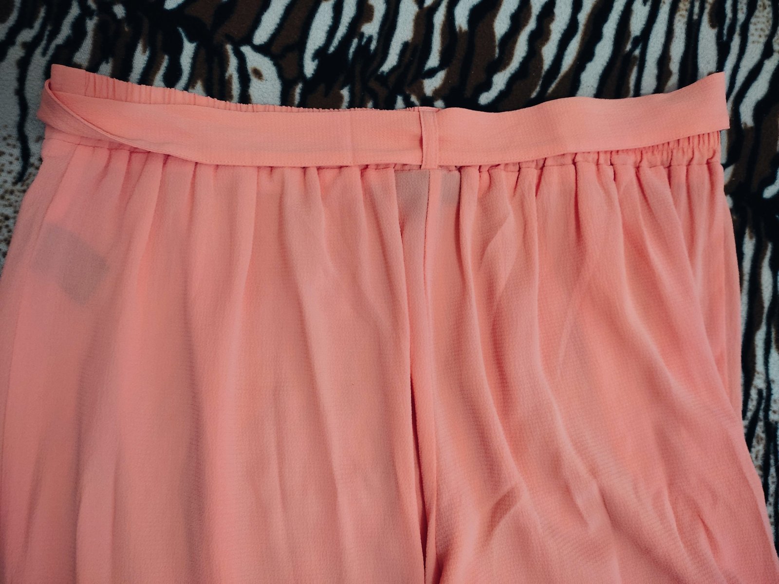 Pantalón color naranja papaya tiene correa en la misma tela , transparenta un poco