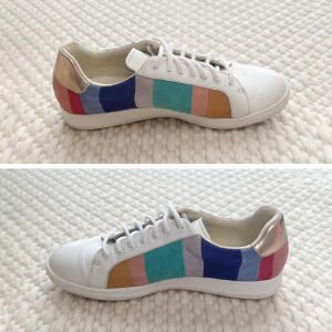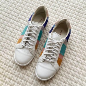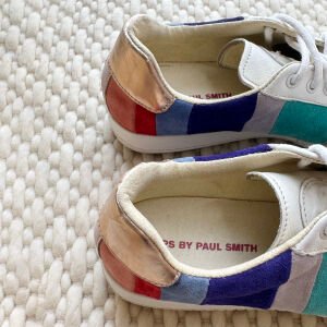 Zapatillas Paul Smith, de la línea PS, blancas de cuero con paneles de gamuza multicolor en cada lado. Suela de goma con relieve de conejo, forrada con cuero alrededor.