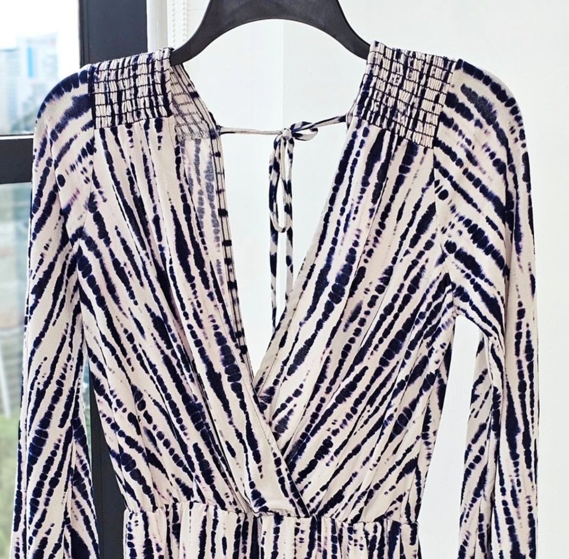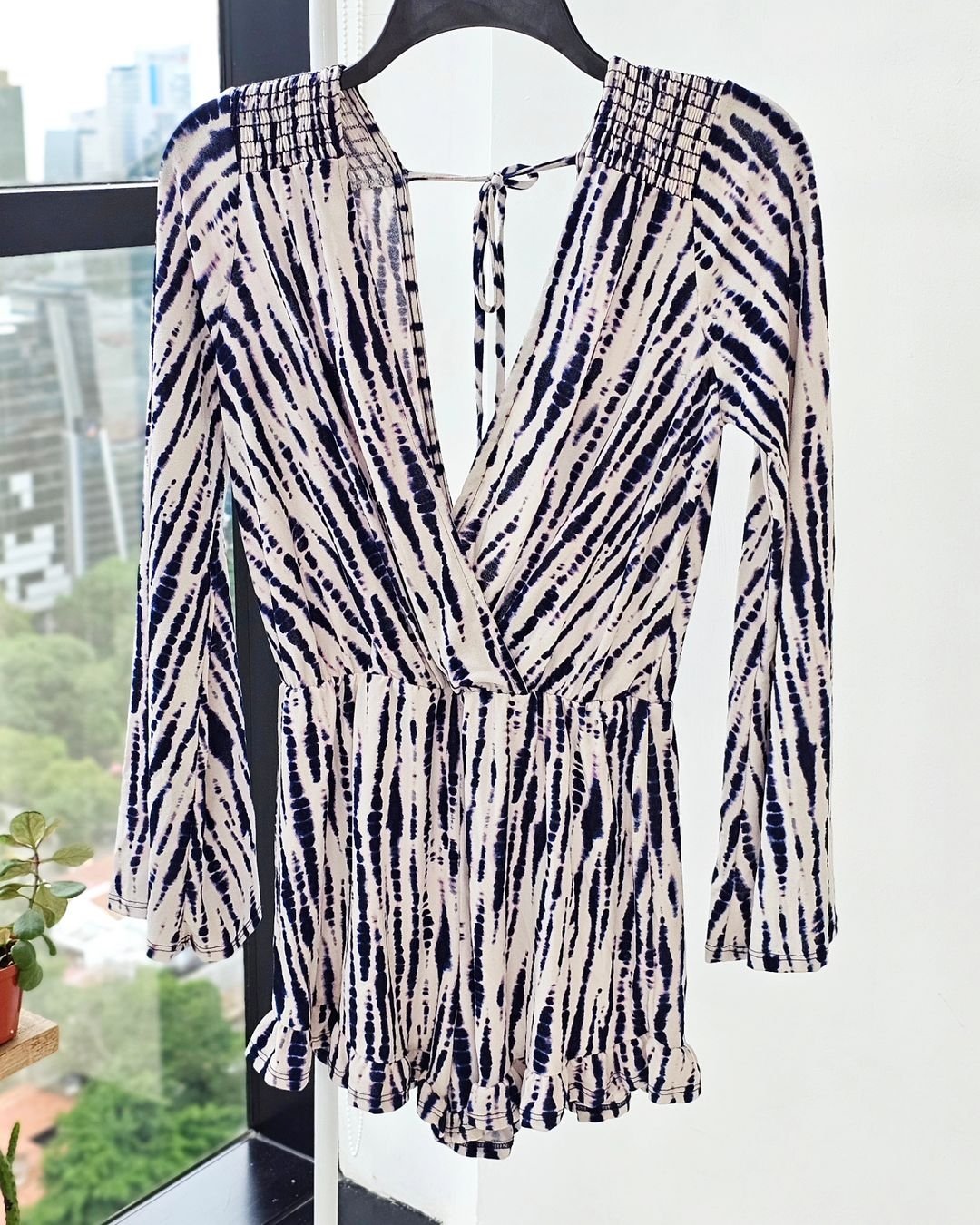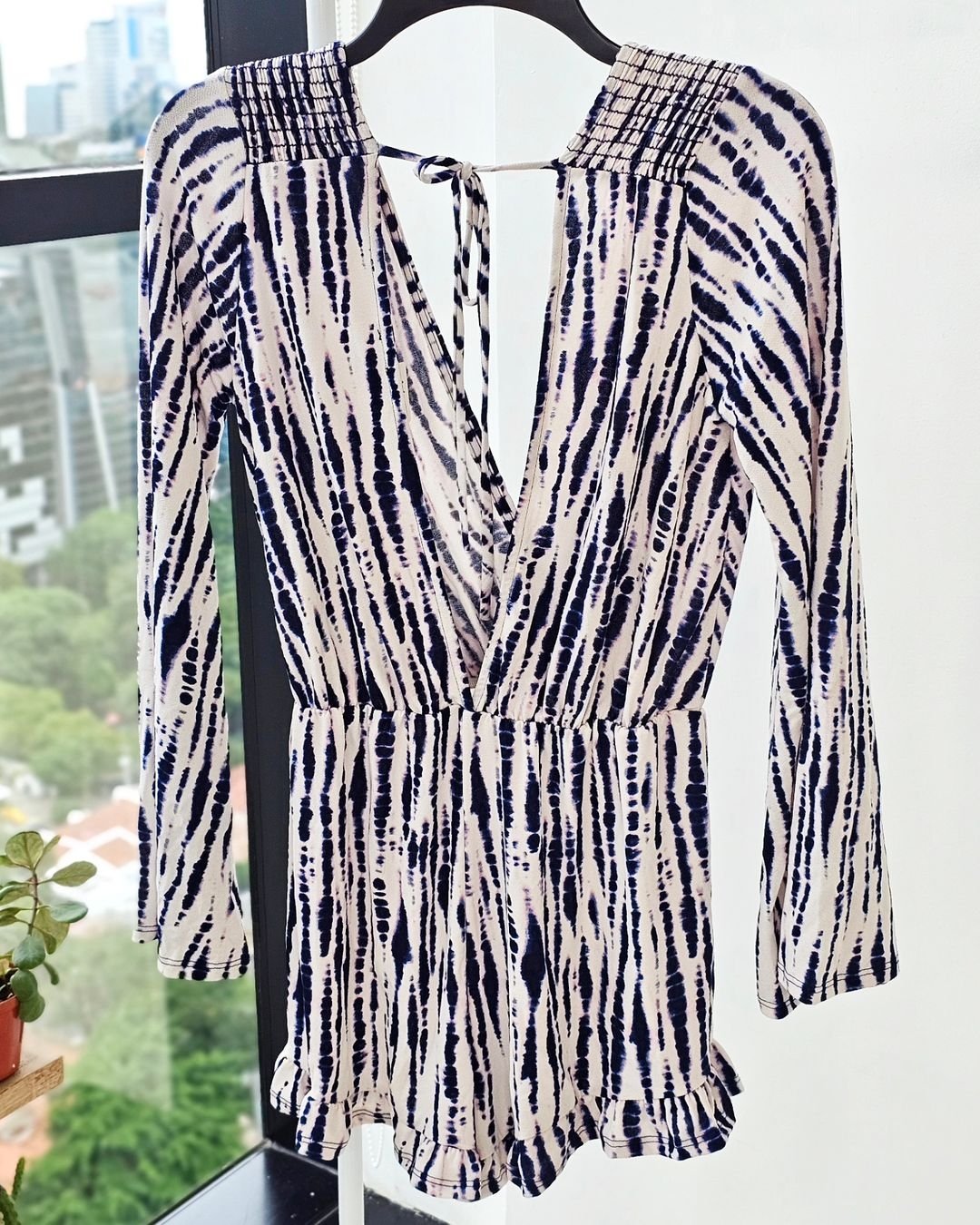 ~ ROMPER ESTAMPADO TYE DYE EN TONOS BLANCO, ROSA Y AZUL, MANGA LARGA Y ESCOTE EN V EN BUSTO Y ESPALDA, ROMPERS ELASTICO EN CINTURA ~ TALLA: L PRECIO: $12