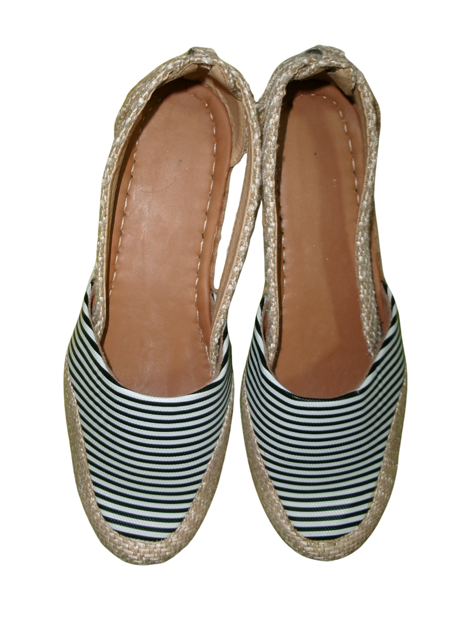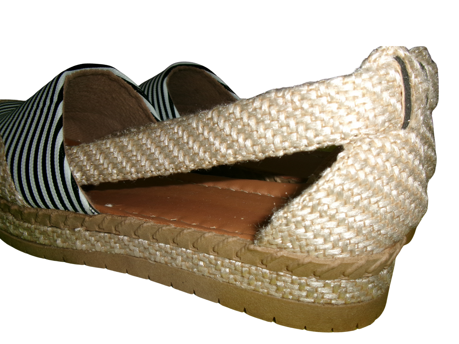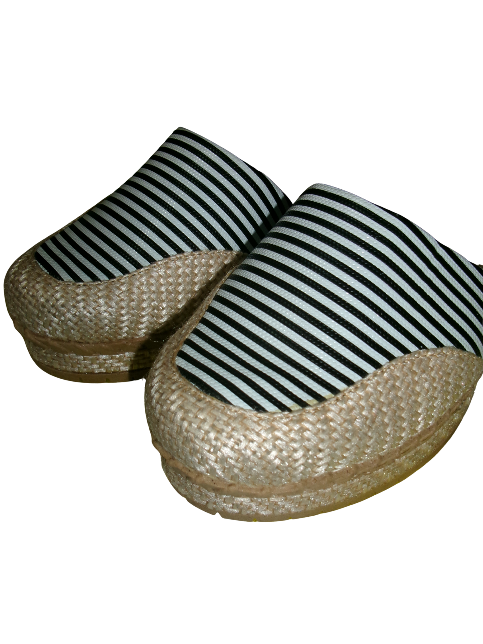 Sandalias planas con estampado de rayas en tonos blanco y negro, con acabado tipo yute que les da un look fresco y natural. Diseño cómodo y ligero, talla 38.