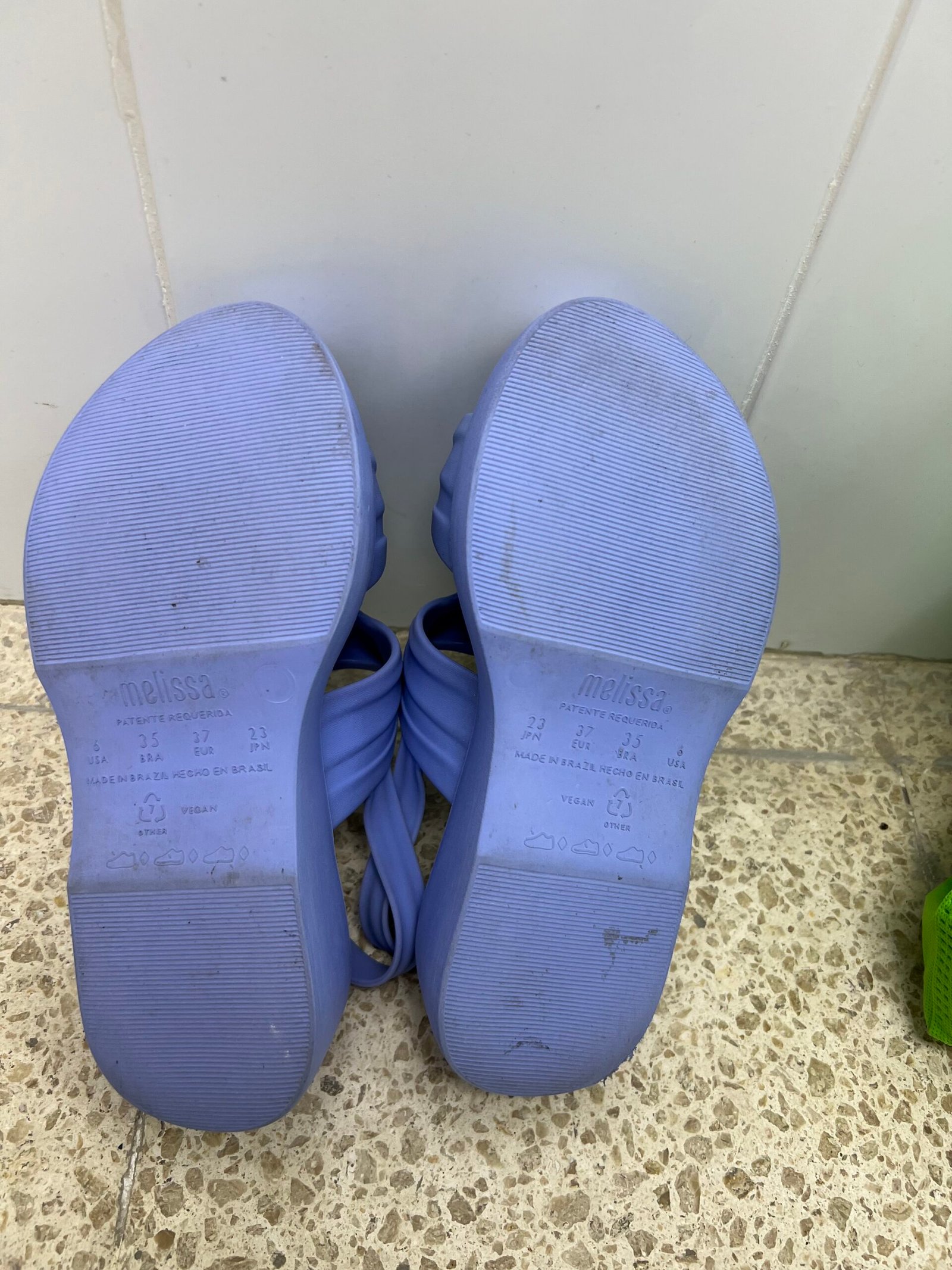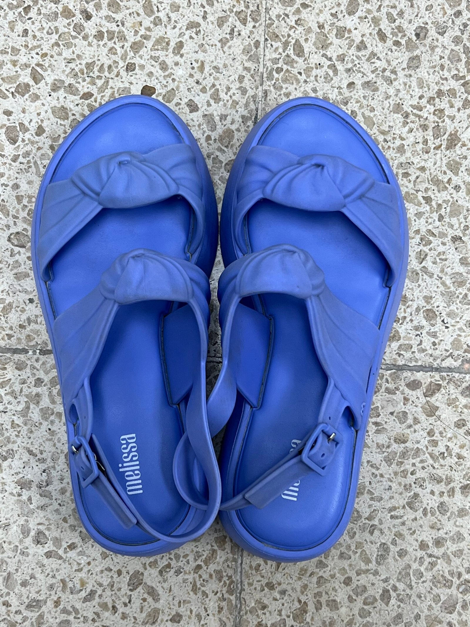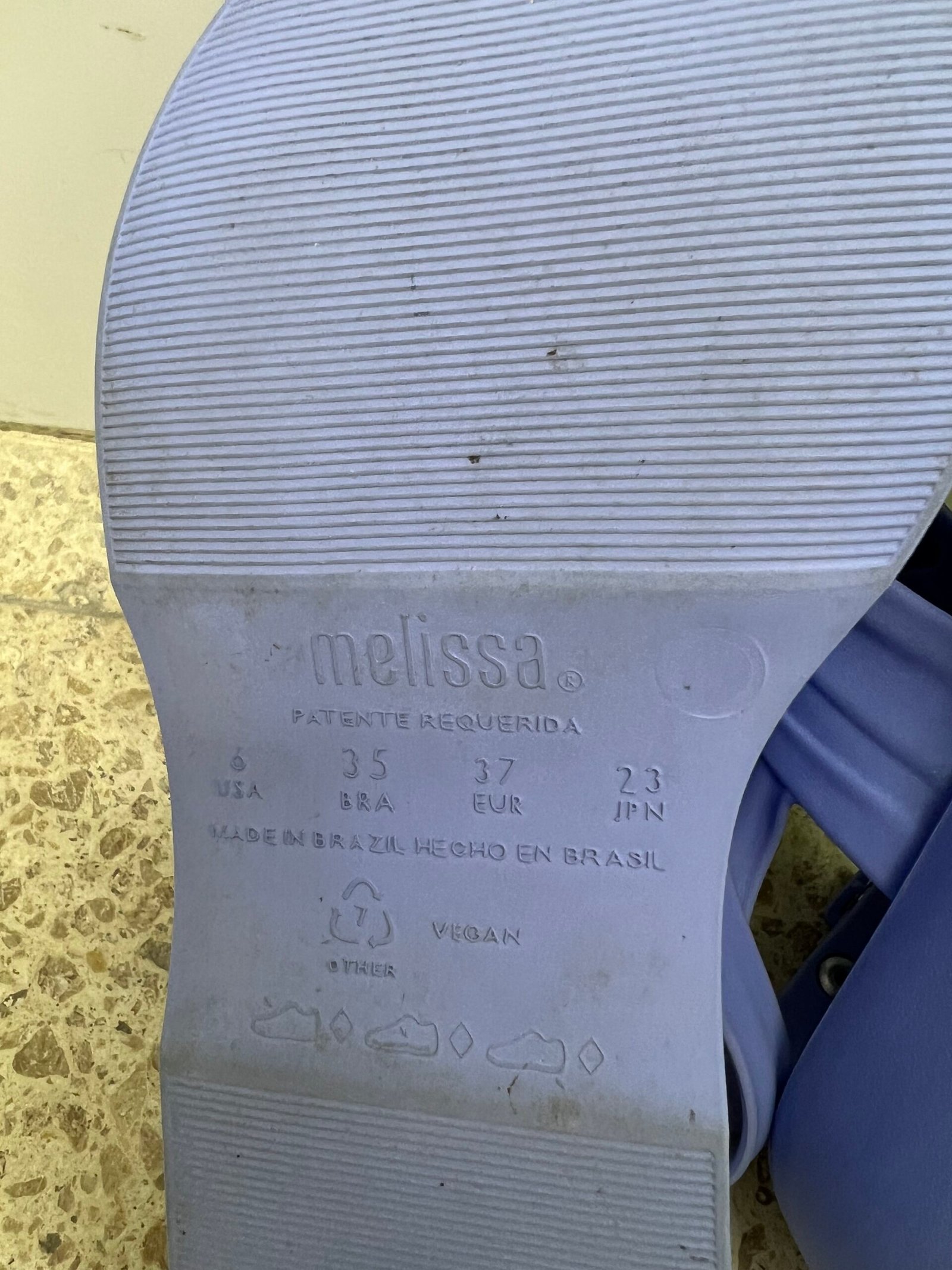 Sandalia talla 6 marca Melissa Color azul lavanda, muy femenino y combinable. Diseño con detalles tipo nudo en las tira, cómodo, flexible y vegano material. Suela en buen estado, con desgaste leve normal por uso (ver fotos)