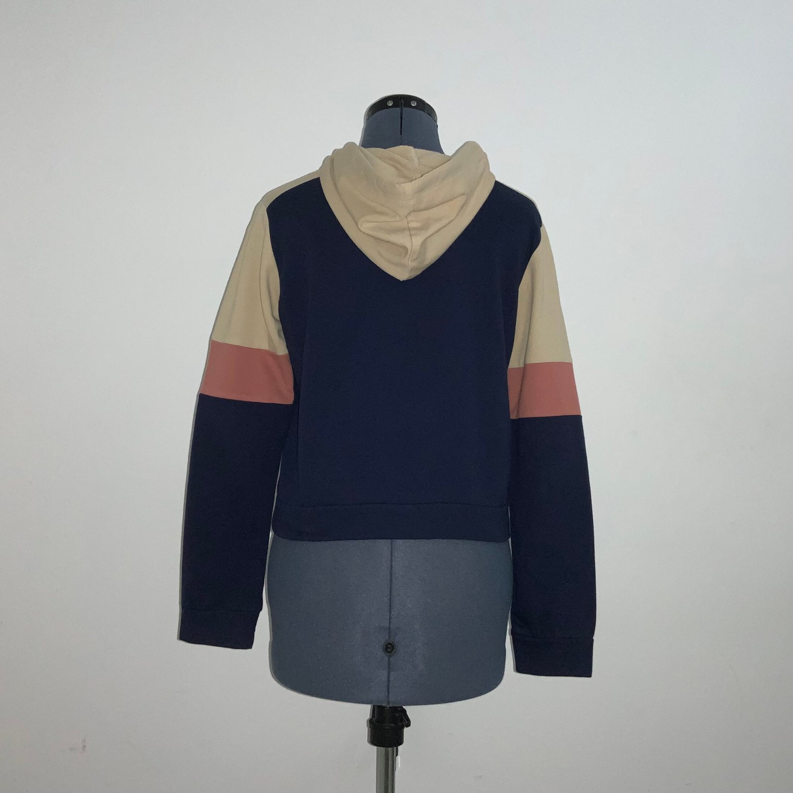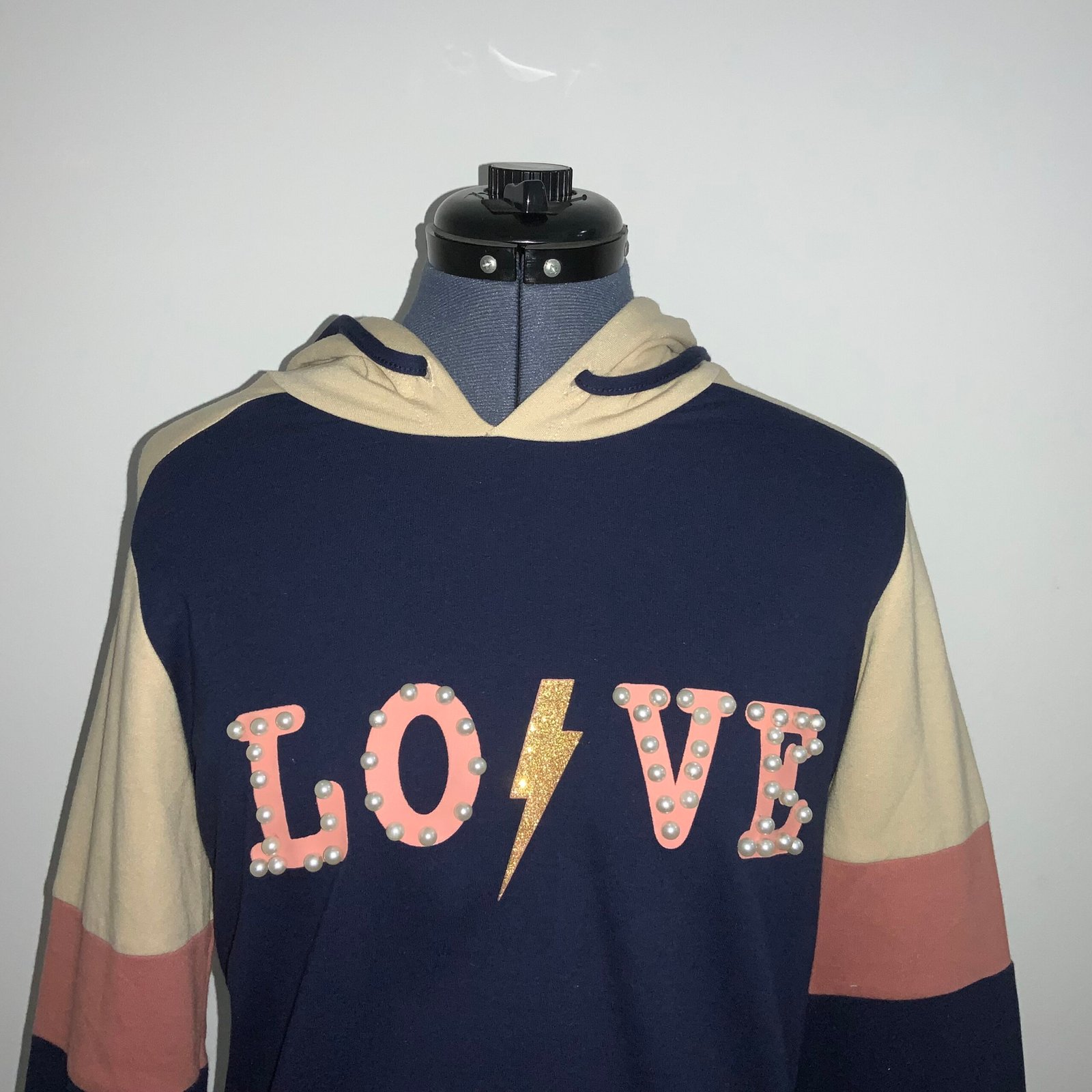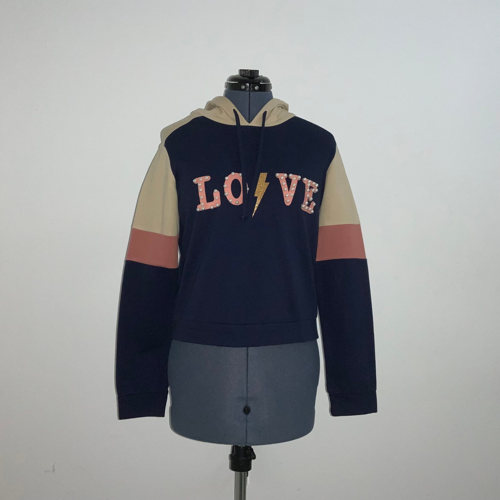 Sudadera (color azul marino, café claro y rosa), marca MOSSIMO. Con gorra, mangas largas, cordones y estampado “LOVE” con perlas y un rayo. Talla grande (corre chica).