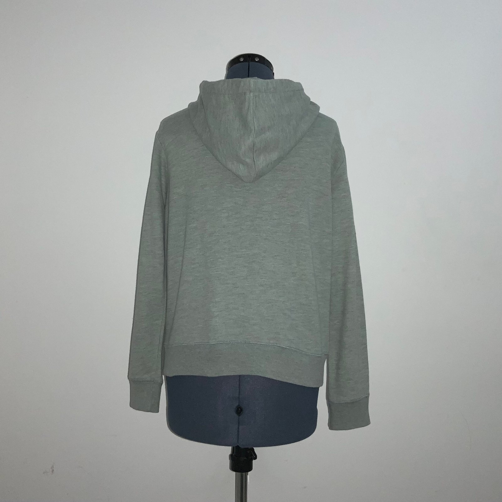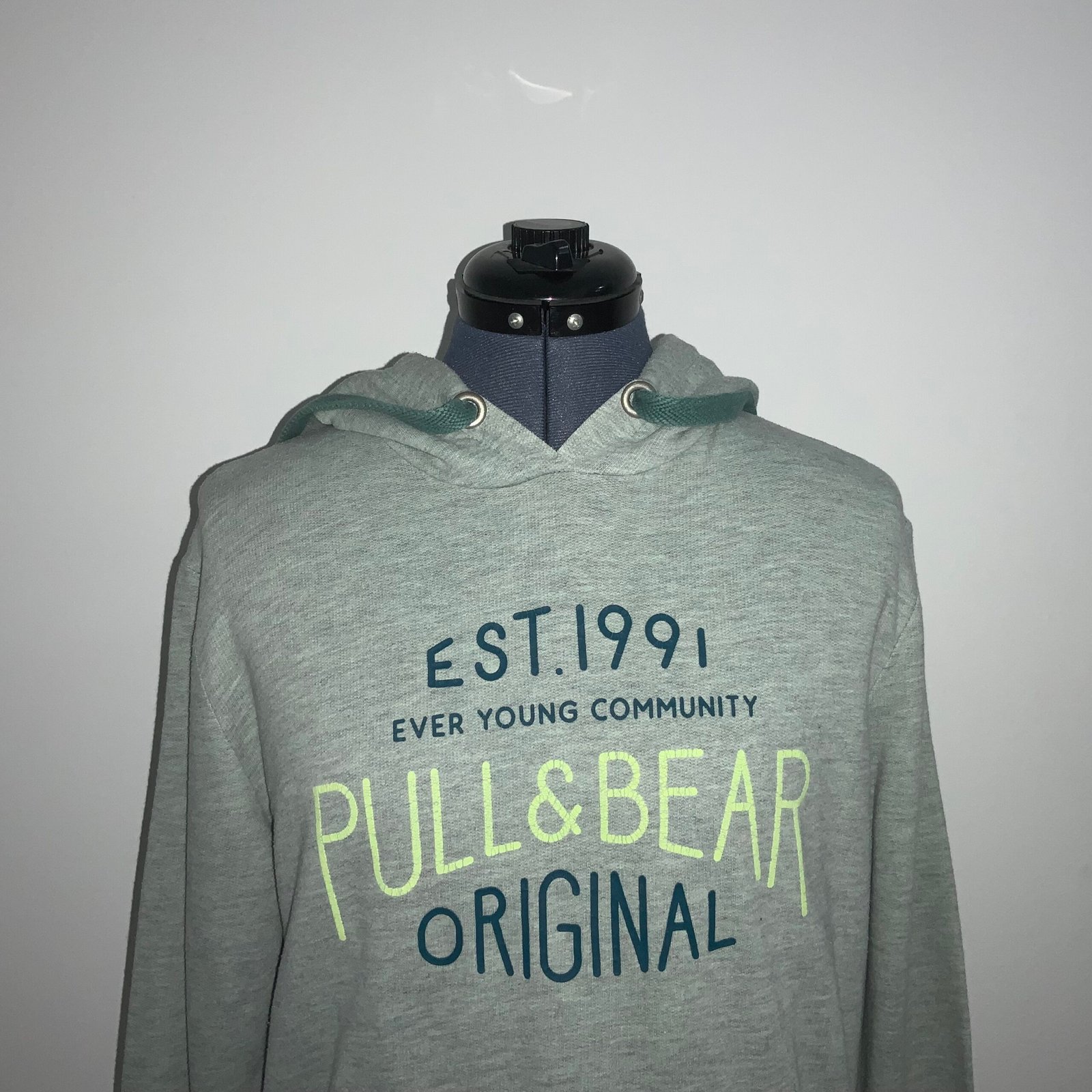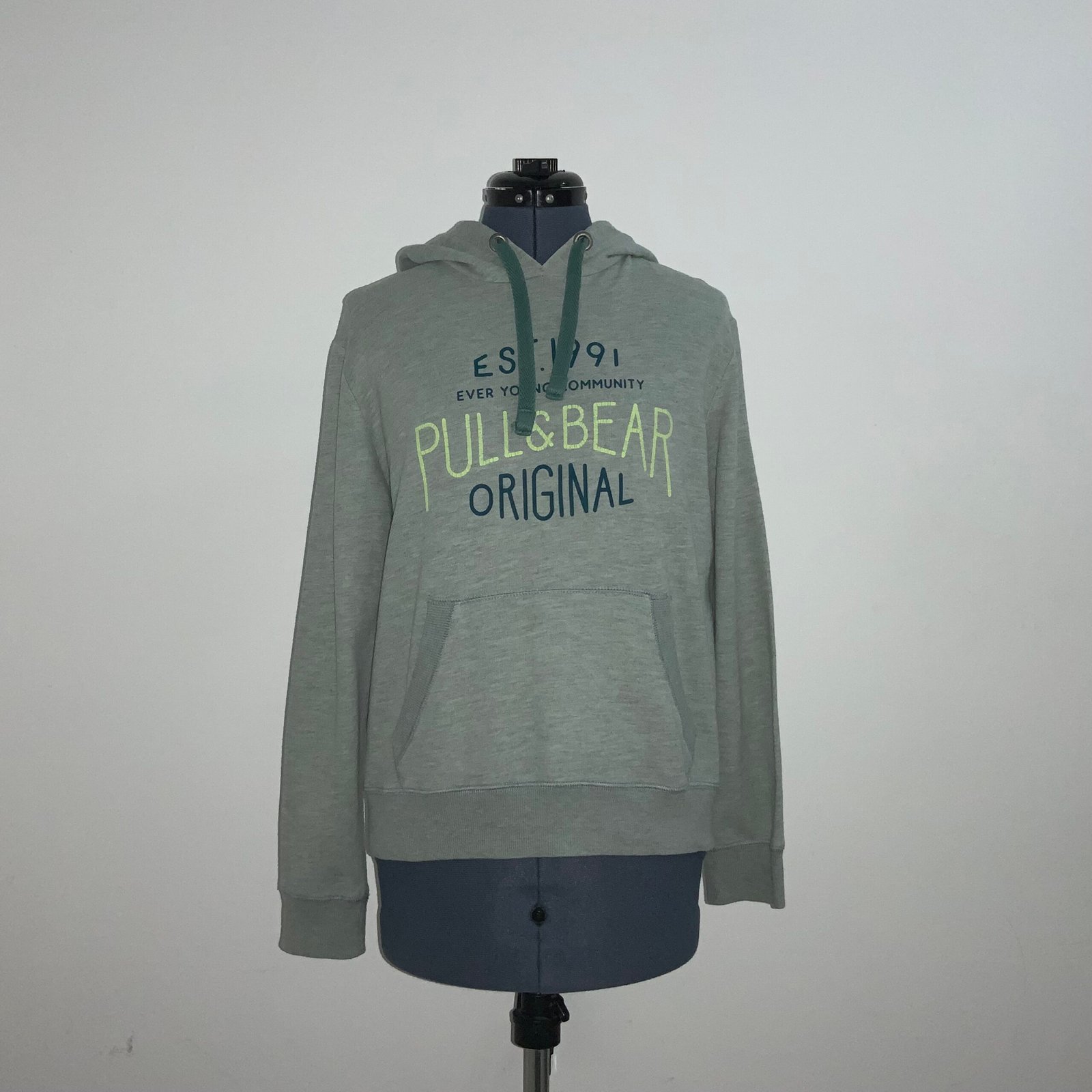 Sudadera color verde grisáceo, marca PULL&BEAR. Con gorra, mangas largas, cordones, bolsillo, estampado de la marca y elástico en puños y cintura. Talla s (corre un poco grande).